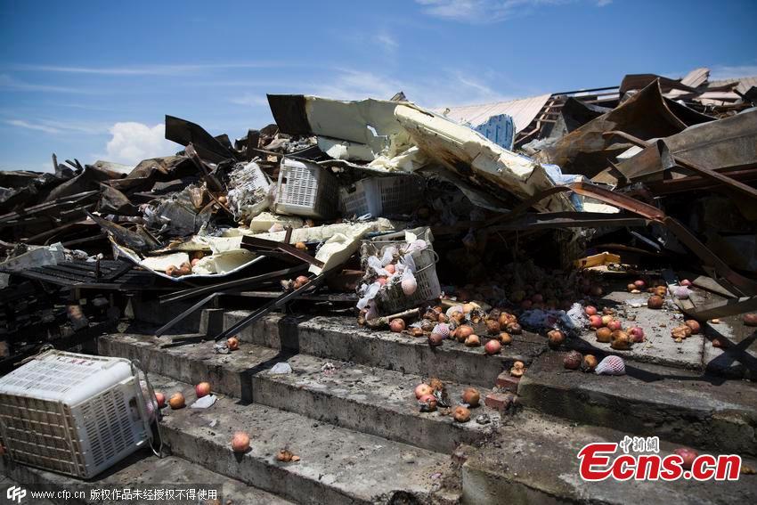 Fruit damaged by fire litter a market in Shenzhen city, South China’s Guangdong province, July 29, 2015. Around 20 fruit stalls in the market were damaged. (Photo/CFP)