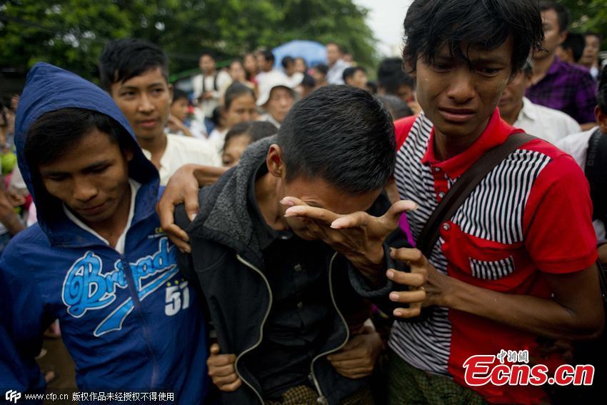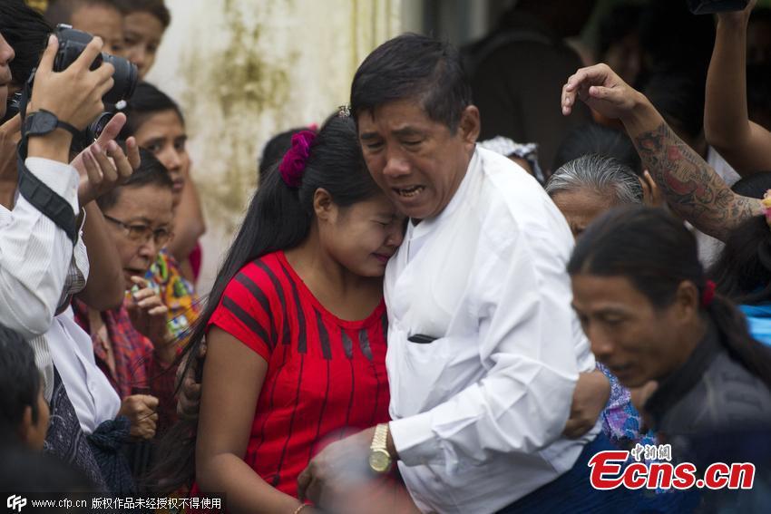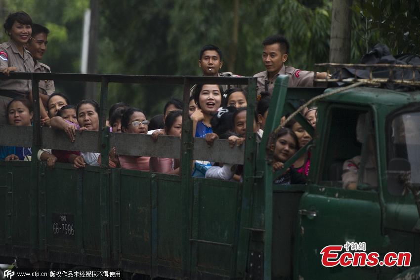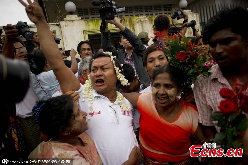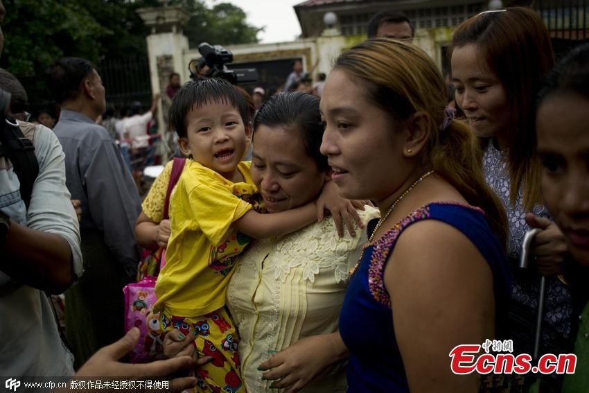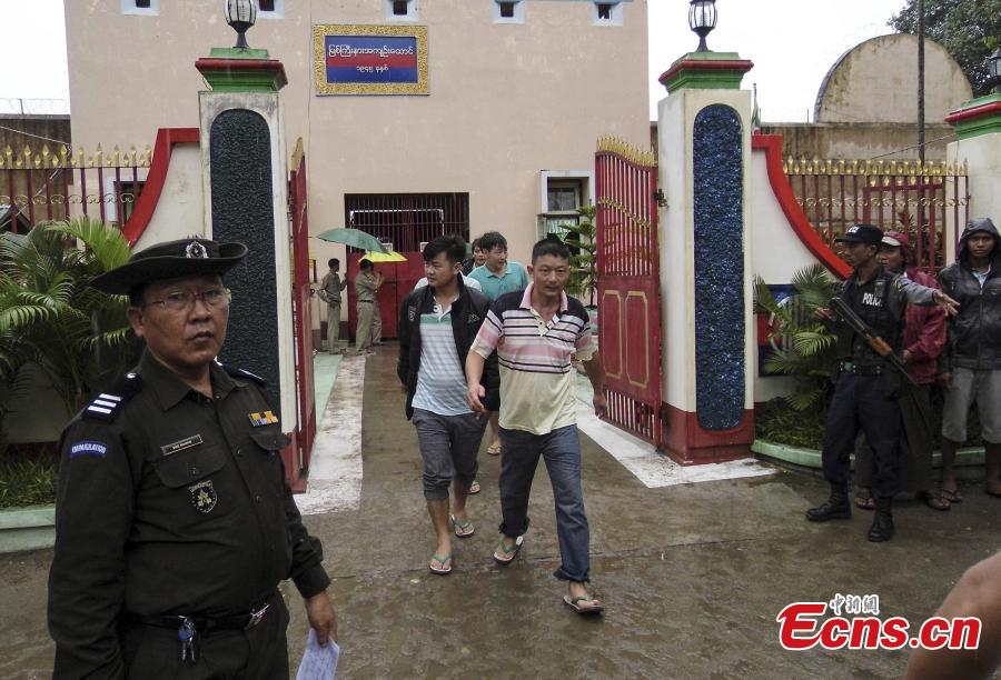 Chinese nationals, who were jailed for illegal logging, walk out of a prison in Myitkyina, capital of Kachin State, Myanmar, after being released during an amnesty, July 30, 2015. A total of 155 Chinese workers sentenced to life in prison for illegal logging were freed in Myanmar on Thursday under a massive presidential pardon that included 6,966 prisoners. (Photo provided to China News Service)