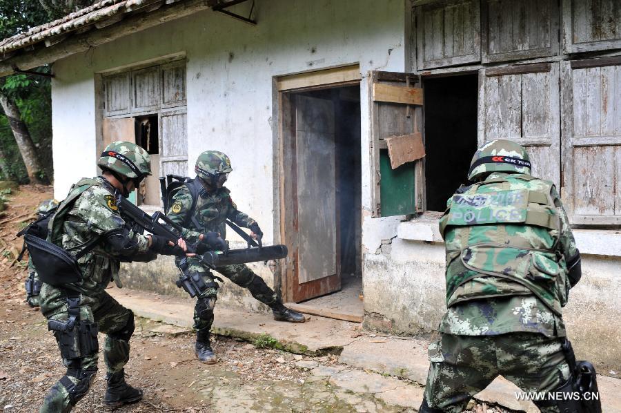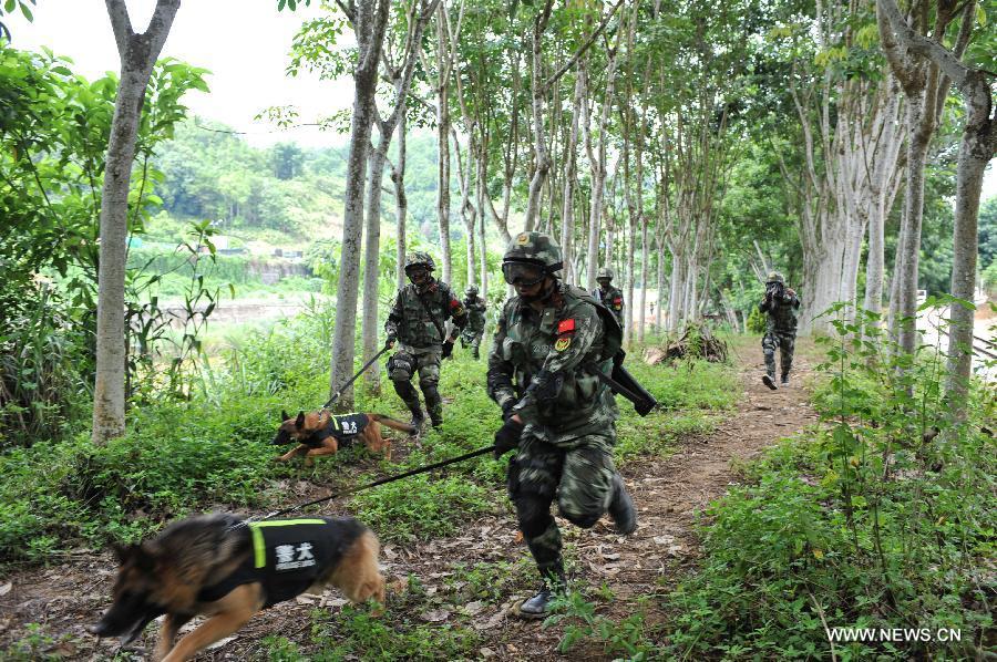 Frontier soldiers attend a joint anti-terrorism drill in Hekou County of Honghe Hani and Yi Autonomous Prefecture, southwest China's Yunnan Province, July 30, 2015. The China-Vietnam joint anti-terrorism drill was held in Hekou County and north Vietnam's Lao Cai Province on Thursday. (Photo: Xinhua/Lv Shuai)