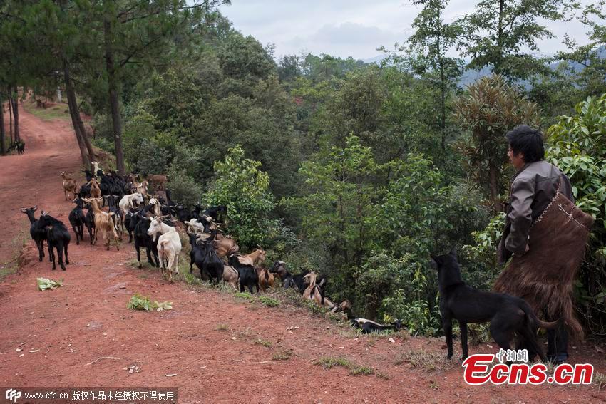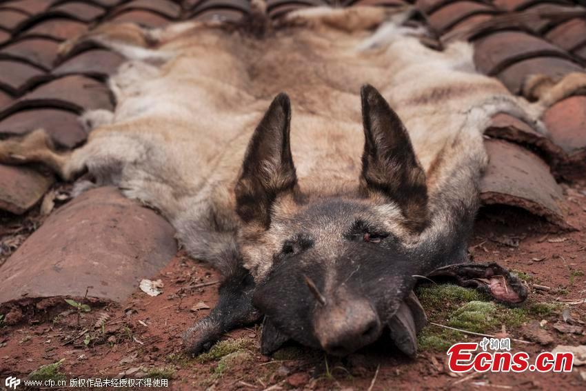 Villagers show off the skin of a wolf in a Miao ethnic minority village in Luquan county, Southwest China’s Yunnan province. Some villagers said they had seen traces of wolves and leopards in the county. They claimed one wolf had been caught, boiled, and only the skin is left. Local police have begun an investigation and also sent samples of the skin for identification. (Photo/CFP)