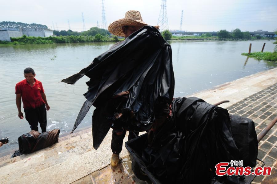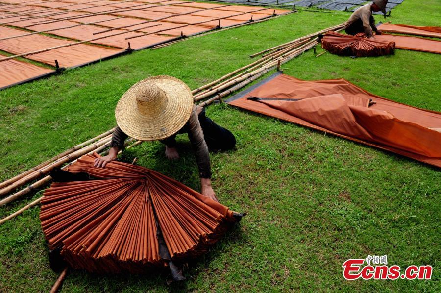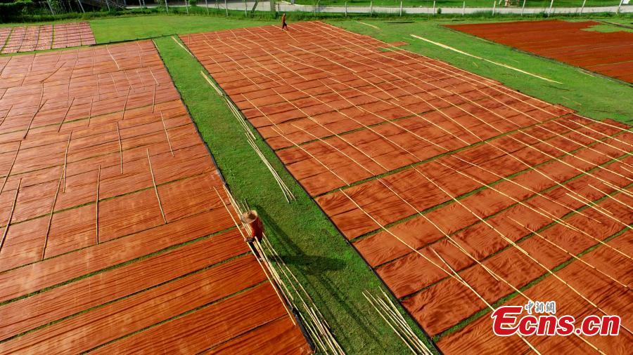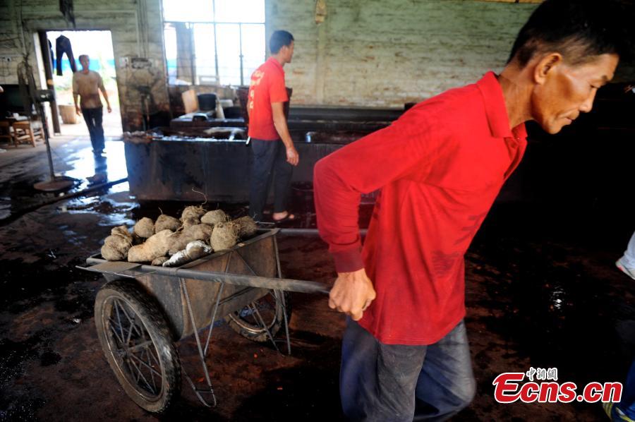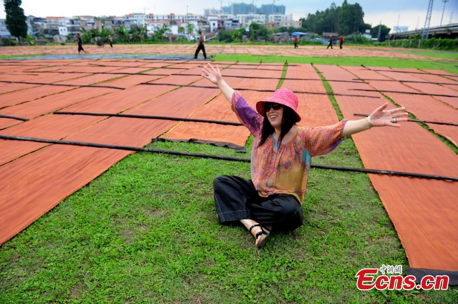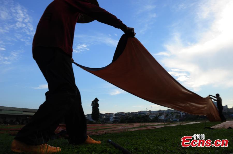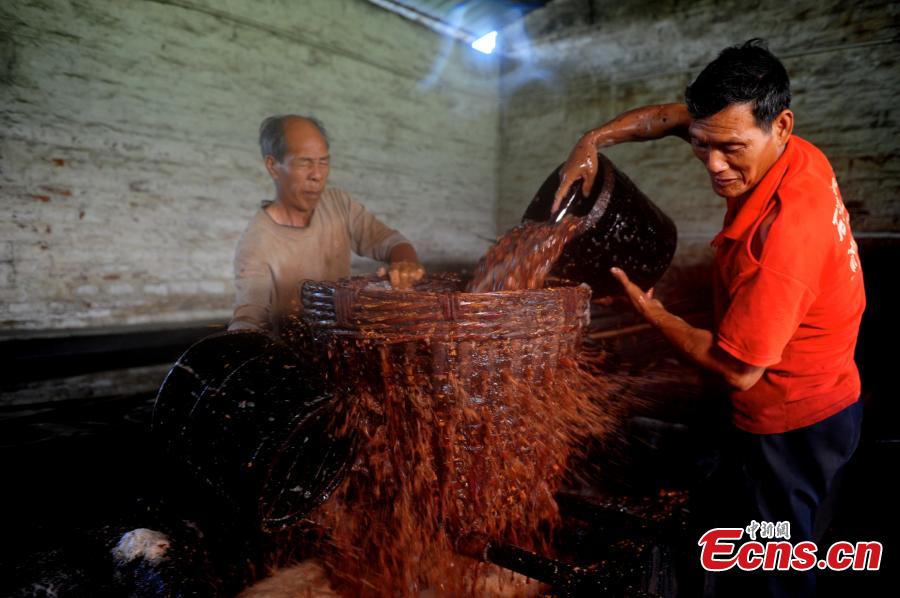 Workers prepare materials to make gambiered silk in Shunde, South China’s Guangdong province. The silk, which is on the national intangible cultural heritage list, takes more than ten complex stages to complete. It is mainly manufactured by dip-dyeing in pure natural plant dyes and is then insulated under the burning sun. (Photo: China News Service/Chen Wen)