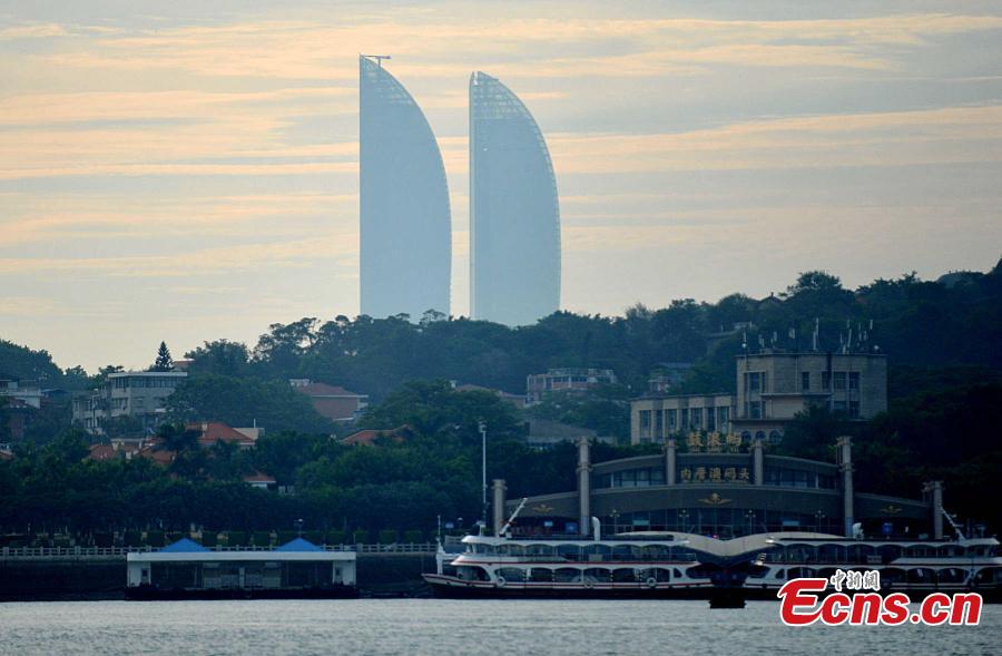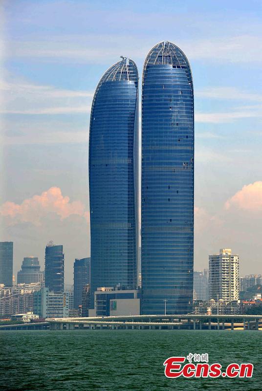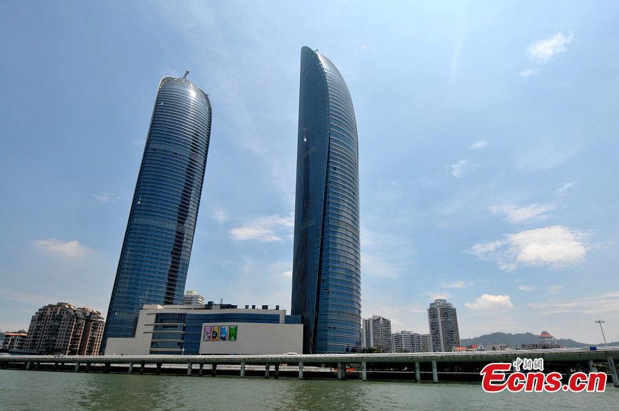 A view of the Twin Towers, which stand at 300 meters each, in Xiamen city, East China’s Fujian province, July 30, 2015. The Twin Towers are expected to be the tallest buildings in Xiamen. One of the towers was recently capped and is expected to be put into use soon. The facility, featuring two 64-floor, sail-like Twin Towers, is also known as Xiamen Shimao Cross-strait Plaza. One of the towers was designed as a SOHO office building, and the other as a comprehensive building for a five-star hotel and high-end offices. (Photo: China News Service/Zhang Bin)