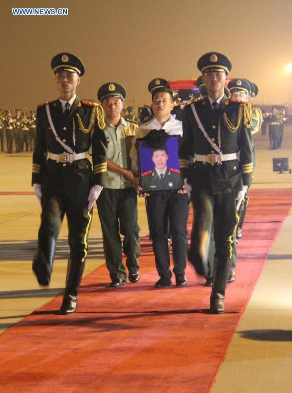 The remains of Chinese guard Zhang Nan killed in a terrorist attack in Somalia is carried by soldiers at Jinan Yaoqiang International Airport in Jinan, capital city of east China's Shandong Province, Aug. 1, 2015. Zhang Nan, the fallen guard, was a security officer in Chinese embassy in Somalia. The remains of Zhang returned to Jinan, with another two wounded guards escorting his coffin. (Xinhua/Lu Yaqi)