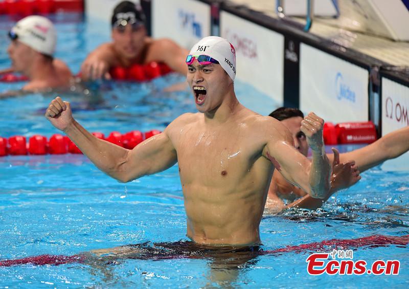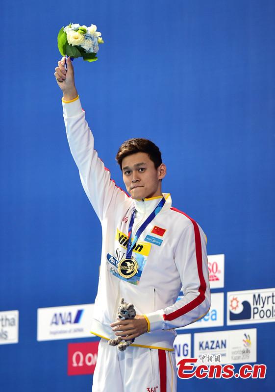 Sun Yang celebrates on the podium after winning the men's 400m freestyle swimming final at FINA World Championships in Kazan, Russia, Aug. 2, 2015. Sun Yang claimed the title of the event in a time of 3 minutes and 42.58 seconds. (CNS photo/Houyu)