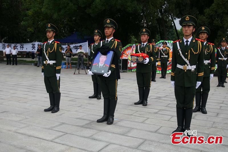 Soldiers escort the deadee of Chinese guard Zhang Nan, who was killed in a terrorist attack in Somalia, during his funeral at the Mausoleum of Martyrs in Cangzhou, north China's Hebei Province, Aug. 2, 2015. (CNS photo/Zhai Yujia)
