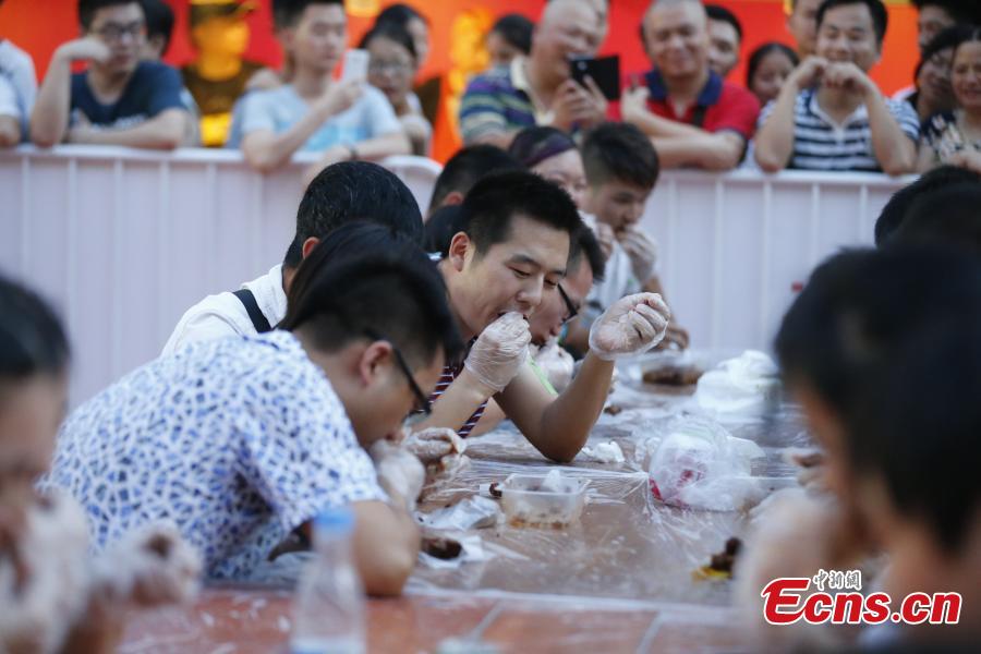 Participants gobble up duck necks, a popular local specialty, during a contest in Wuhan city, capital of Central China’s Hubei province, Aug 2, 2015. Participants were asked to finish a 350g box of duck necks and leave no more than 150g of bones in as fast a time as possible. (Photo: China News Service/Cheng Guo)