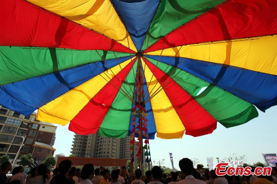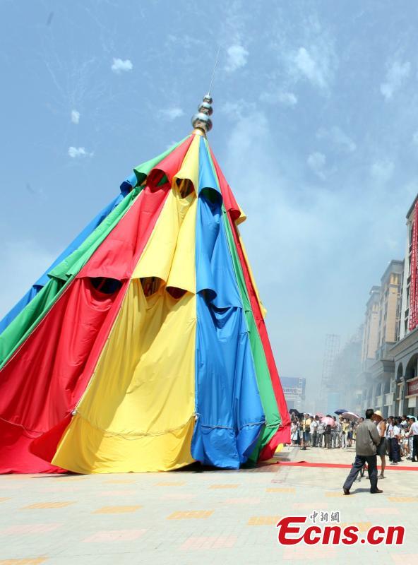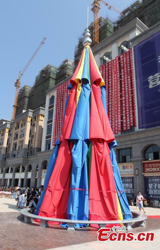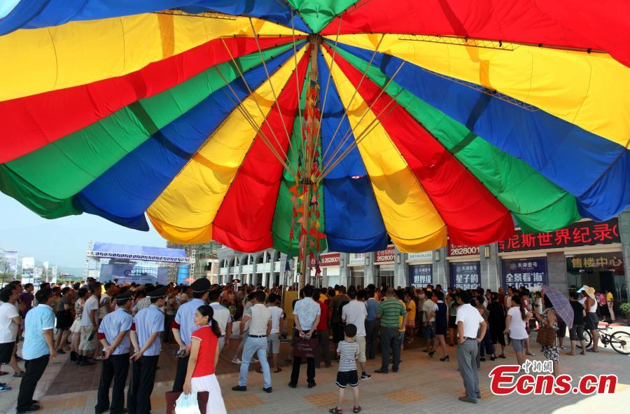 An umbrella of 23 meters in diameter and 18 meters in height is certificated as the world's largest umbrella by Guinness World Records in Xingzi county, East China’s Jiangxi province, Aug 3, 2015. The umbrella weighs 5.7 tonnes and can cover an area of 418 square meters. A company invested 700,000 yuan($113,000) to build the umbrella in half a year. (Photo: China News Service/Wei Dongsheng)
