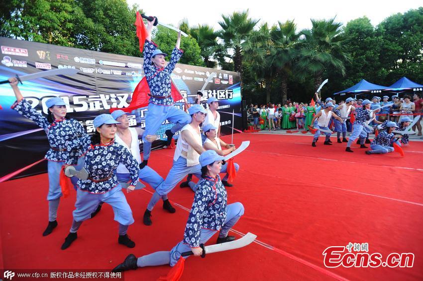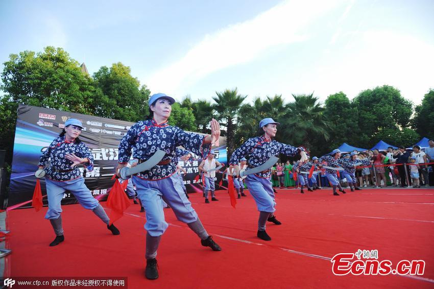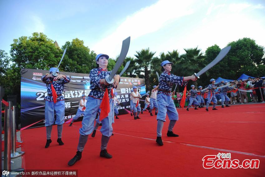Performers dance with machetes during a square dancing contest in Wuhan city, Capital of Central China’s Hubei province, August 1, 2015. Some Chinese middle-aged or retired women, often called Dama, come together to dance in squares, plazas and parks. However, the pastime can cause conflict with neighbors unhappy about the loud music or with other groups competing to use limited public space. Aug 1 is also China’s Army Day. (Photo/CFP)