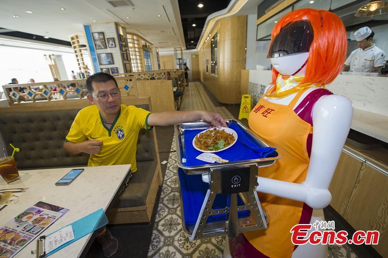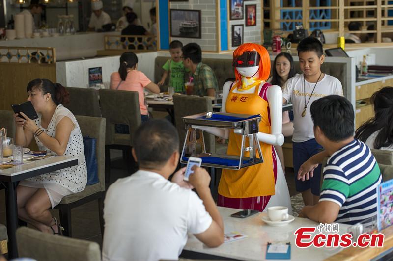 A robot waitress about 1.5 meters works for a Hong Kong style tea restaurant in Haikou, Hainan Province, in August 3,2015.Her Life is about 7 to 10 years, after an electric charge she can keep working 12 hours. She can speak, serve food, sing and greet. (CNS photo/Luo Yunfei)