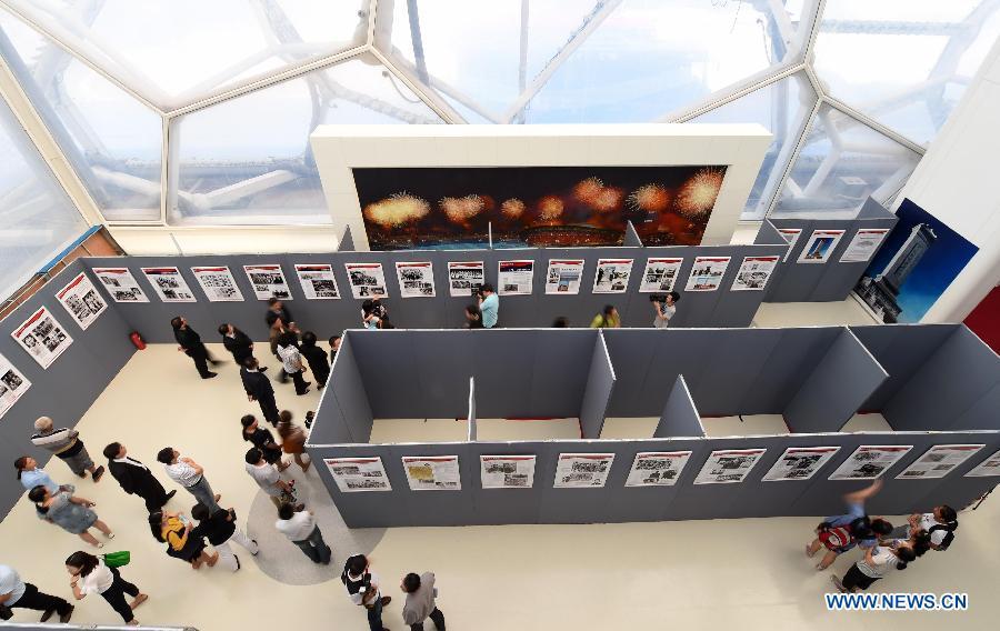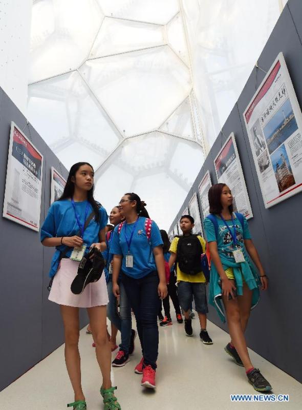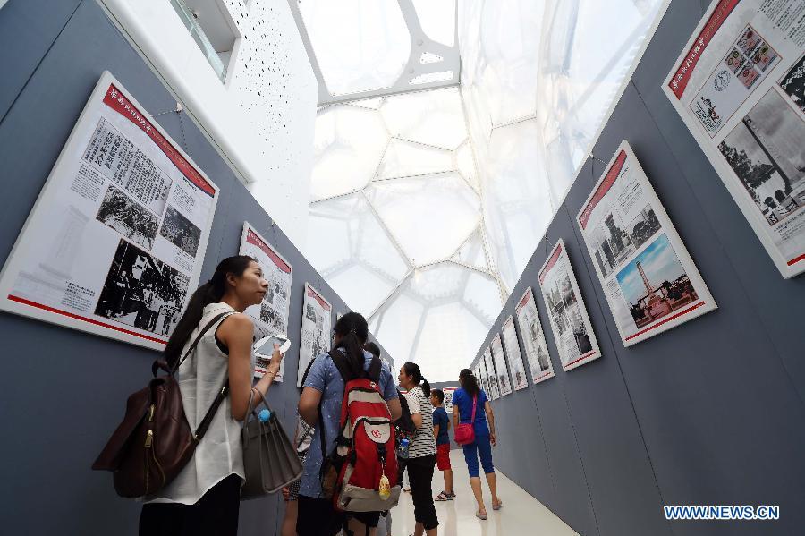 Youth visit a photo exhibition with the theme of "Overseas Chinese and the Chinese People's War of Resistance against Japanese Aggression" at National Aquatics Center in Beijing, capital of China, Aug. 4, 2015. The photo exhibition kicked off on Tuesday to mark the 70th anniversary of the victory of the Chinese People's War of Resistance against Japanese Aggression. (Photo: Xinhua/Chen Yehua)