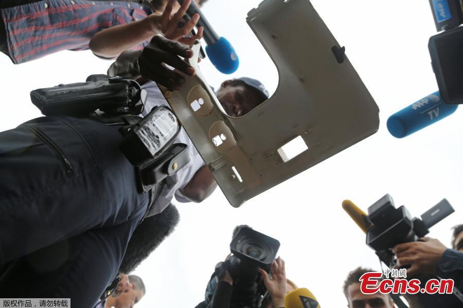 A police officer holds a piece of plastic found in Saint-Denis on Reunion Island in the Indian Ocean, Aug 4, 2015. Police are investigating a piece of plastic molding that washed up on a beach at Saint-Denis, the capital of Reunion Island, where part of an airplane wing suspected to be from the missing Malaysia Airlines Flight 370 was found last week. Some speculated the plastic could be from a plane window, but others were skeptical. (Photo provided to China News Service)