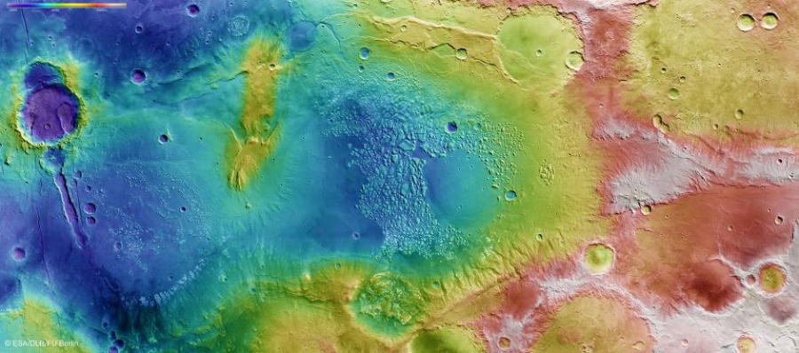 This colorful image is a topography map of a portion of the region known as Terra Sirenum, located in the southern hemisphere of Mars. The map is color-coded, with reds and whites representing the highest topography and blues and purples the lowest. The image shows a myriad of terrain types including cliffs, impact craters, channels carved into steep slopes, wrinkled ridges and scarps, which together reflect a rich geological history. Perhaps the most prominent feature is the portion of uneven chaotic terrain towards the center of the image. This is Atlantis Chaos, a lowland plain covering around 170 km by 145 km and containing a few hundred small peaks and flat-topped hills. They are thought to result from the slow erosion of a once-continuous solid plateau. (Photo/ The European Space Agency)