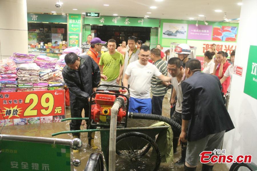 Rescuers pump water from a flooded supermarket after rainstorm in Qingyang city, Northwest China’s Gansu province, Aug 2, 2015. Floodwater destroyed roads and many stores in low-lying areas. (Photo: China News Service/Zheng Bing)