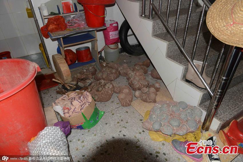 Fossilized dinosaur eggs and an intact dinosaur skeleton have been seized from a house in Heyuan city, South China’s Guangdong province. During a recent campaign, police found 213 fossilized dinosaur eggs, most of which are from Heyuan. Heyuan is popularly known as the "Home of Dinosaurs." The city also holds the record for the largest collection of dinosaur egg fossils in the world, with 10,008, according to the Guinness Book of World Records.(Photo/CFP)