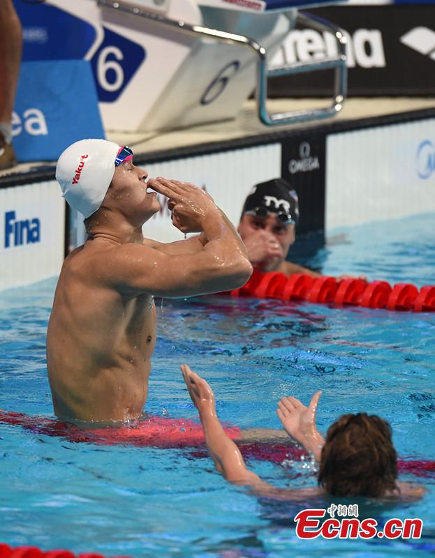 Sun Yang of China reacts after winning the men's 800m freestyle final at the Aquatics World Championships in Kazan, Russia, Aug 5, 2015. (Photo: China News Service/Hou Yu)