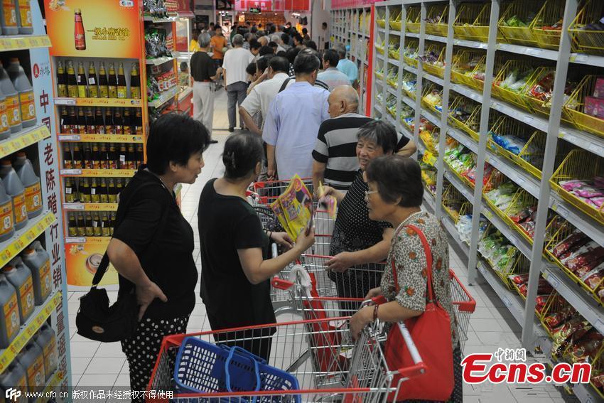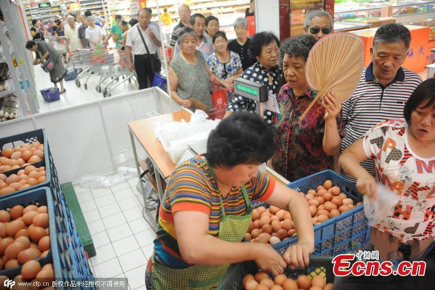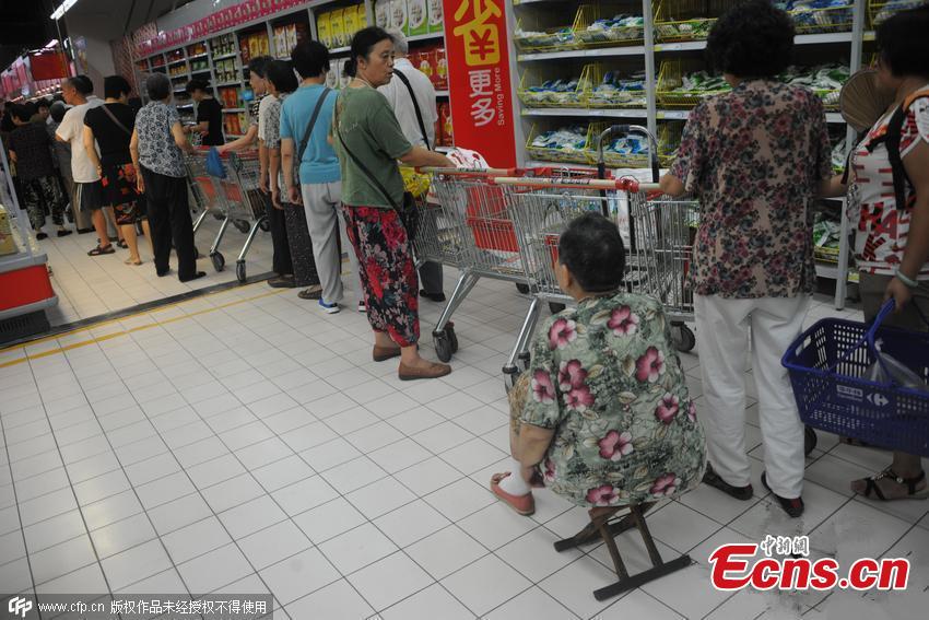 Elderly shoppers queue to buy discounted eggs at a supermarket in Jinan, East China’s Shandong province, Aug 6, 2015. Some customers brought folding stools to sit on while they waited in the line, which was approximately 100 meters long. (Photo/CFP)