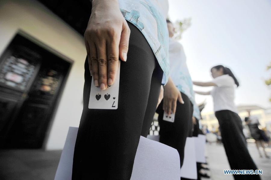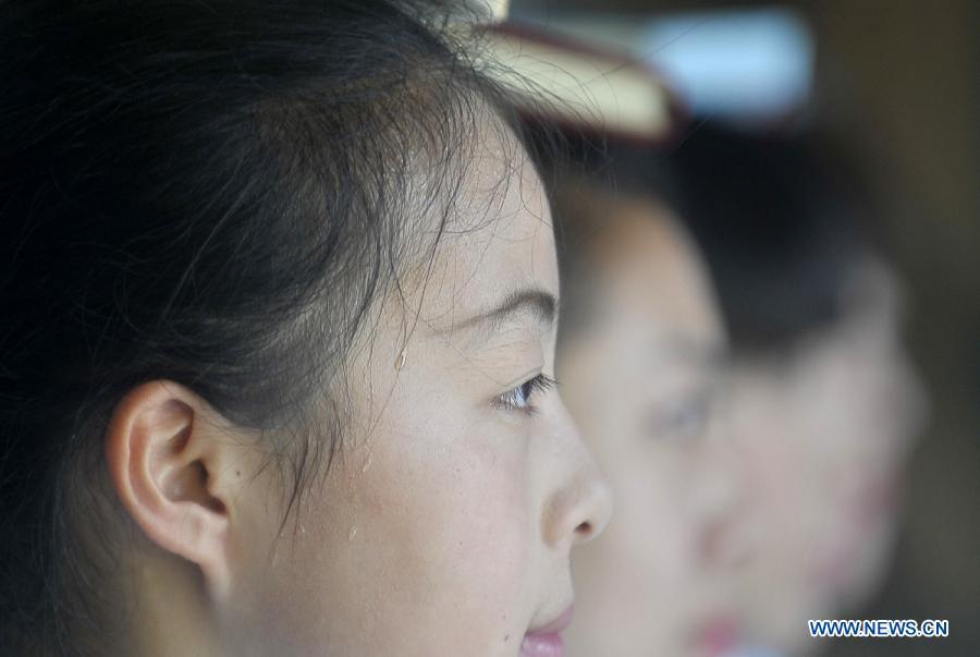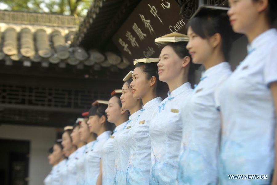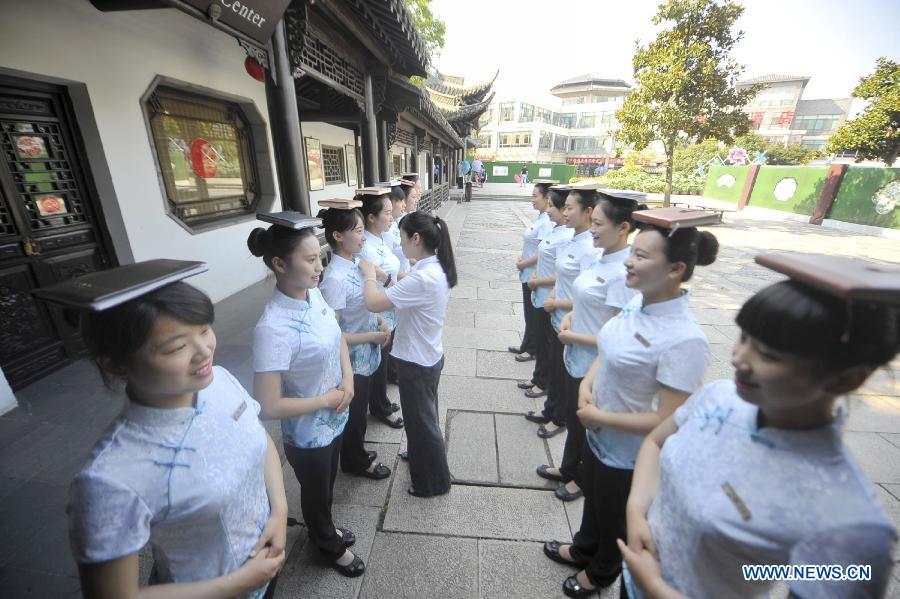 A tour guide receives training at the Slender West Lake in Yangzhou, east China's Jiangsu Province, Aug. 5, 2015. (Photo: Xinhua/Meng Delong)