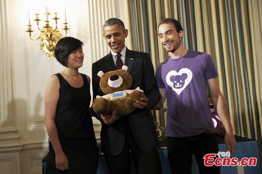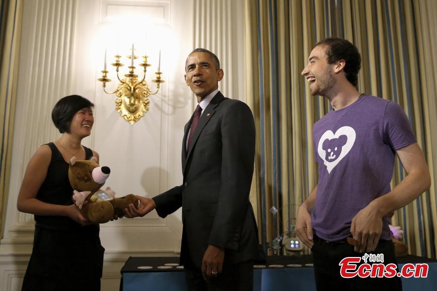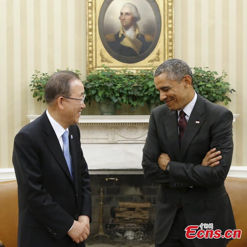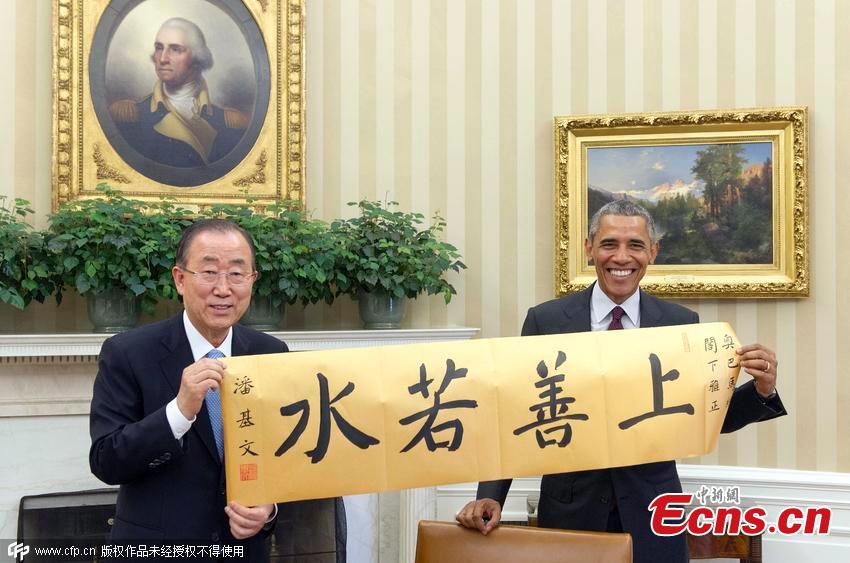 UN Secretary-General Ban Ki-moon presents his calligraphy work to US President Barack Obama as a birthday gift in the Oval Office at the White House in Washington, Aug 4, 2015. The Chinese characters “Shang Shan Ruo Shui” mean the highest level of good deeds is like water that benefits to all things without struggle. (Photo/CFP)
