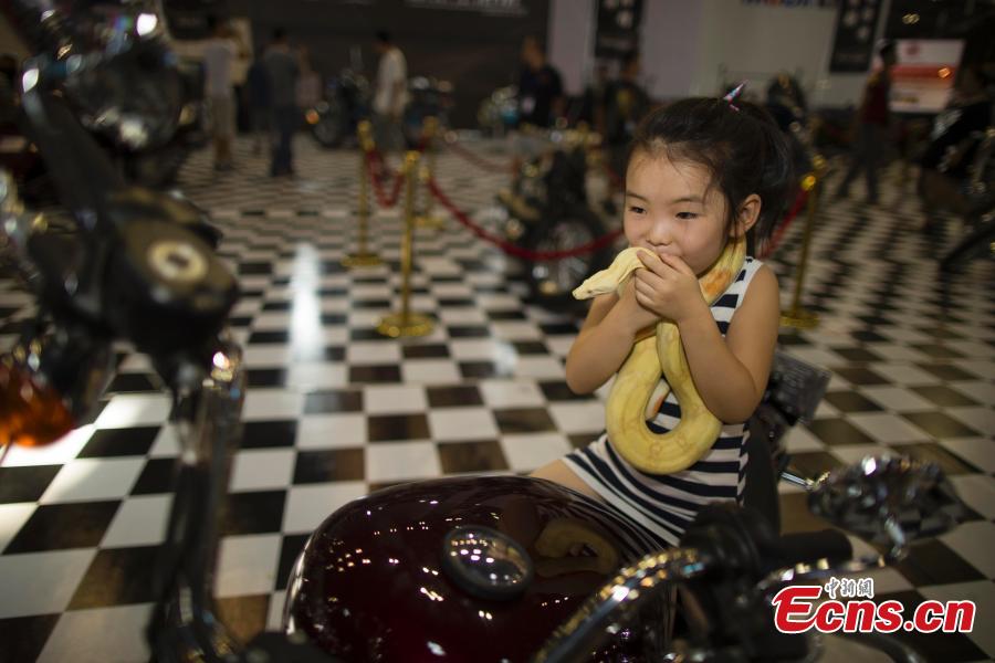 A girl carrying a Burmese python poses during the 5th Taiyuan International Auto Show in Taiyuan city, capital of North China’s Shanxi province, Aug 6, 2015. The four-day auto show attracted more than 20 domestic and foreign auto brands. (Photo: China News Service/Zhang Yun)