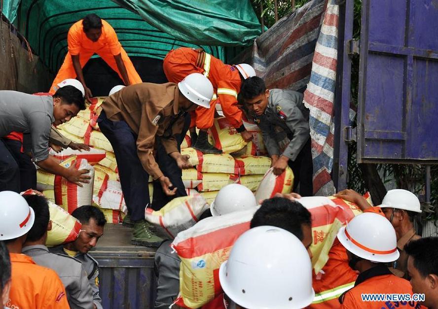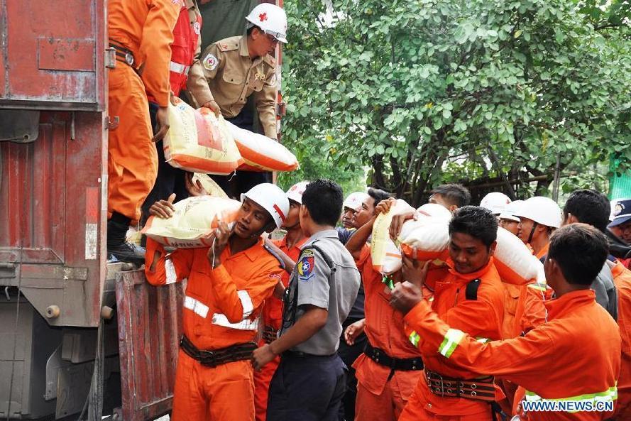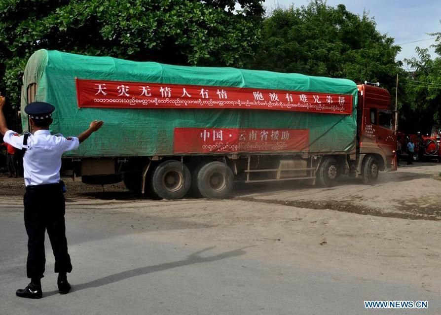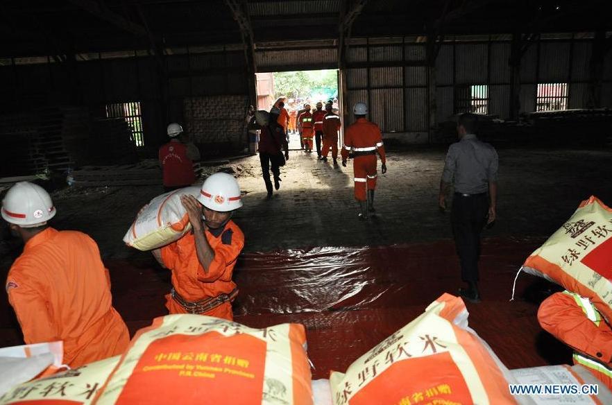 Rescuers unload China-donated relief aid from a truck in Mandalay, Myanmar, Aug. 7, 2015. China's southwestern Yunnan provincial government donated relief aid to Myanmar on Friday, where floods have left 88 people dead and tens of thousands of others affected. (Photo: Xinhua/San San)