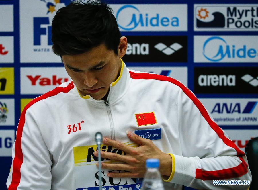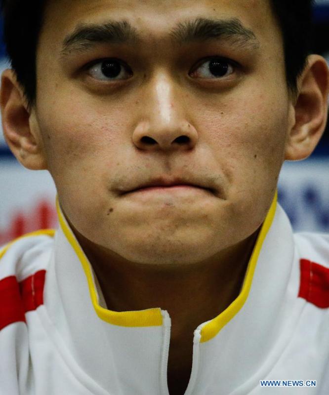 Chinese swimming star Sun Yang reacts during a conference at the FINA World Championships in , Russia, Aug. 9, 2015. Sun Yang gave up his chance to defend his 1,500m freestyle title at the Kazan world championships as the 23-year-old withdrew from the final minutes before it started due to heart discomfort on Sunday. (Xinhua/Zhang Fan)