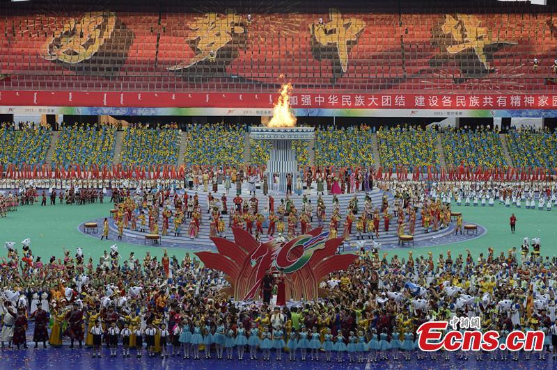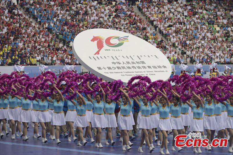The emblem of the event is carried into the stadium during the opening ceremony of the 10th National Traditional Games of Ethnic Minorities of China in Ordos, north China's Inner Mongolia Autonomous Region, Aug. 9, 2015. (CNS photo/Liu Wenhua)