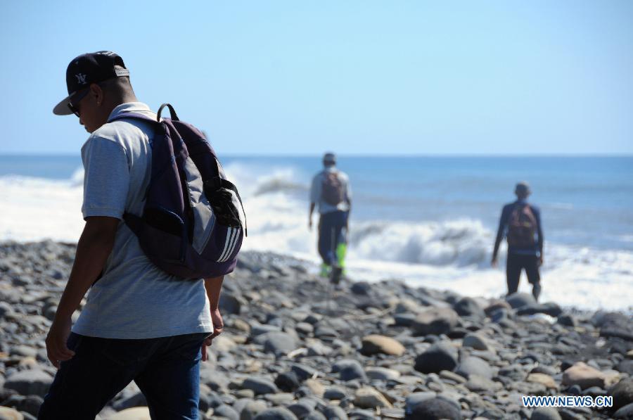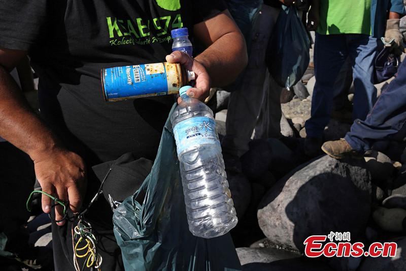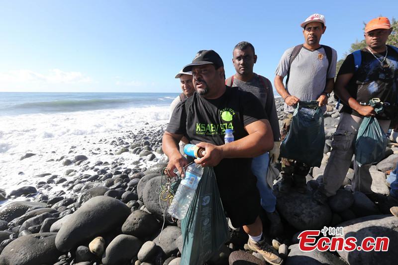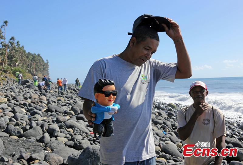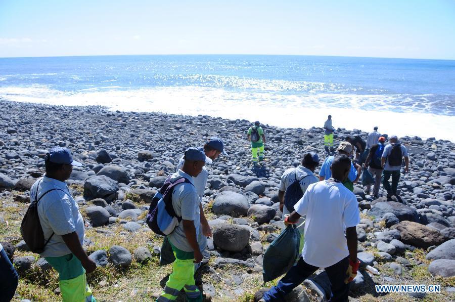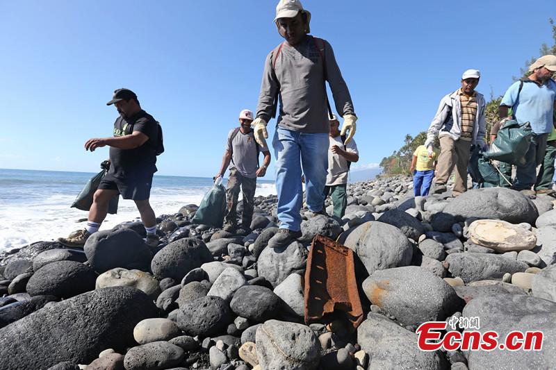 A team of beach cleaners searches for more possible plane debris near the area where a wing flap was washed up near Saint-Andre on the north coast of the Indian Ocean island of Reunion, Aug 10, 2015. (Photo/Agencies)