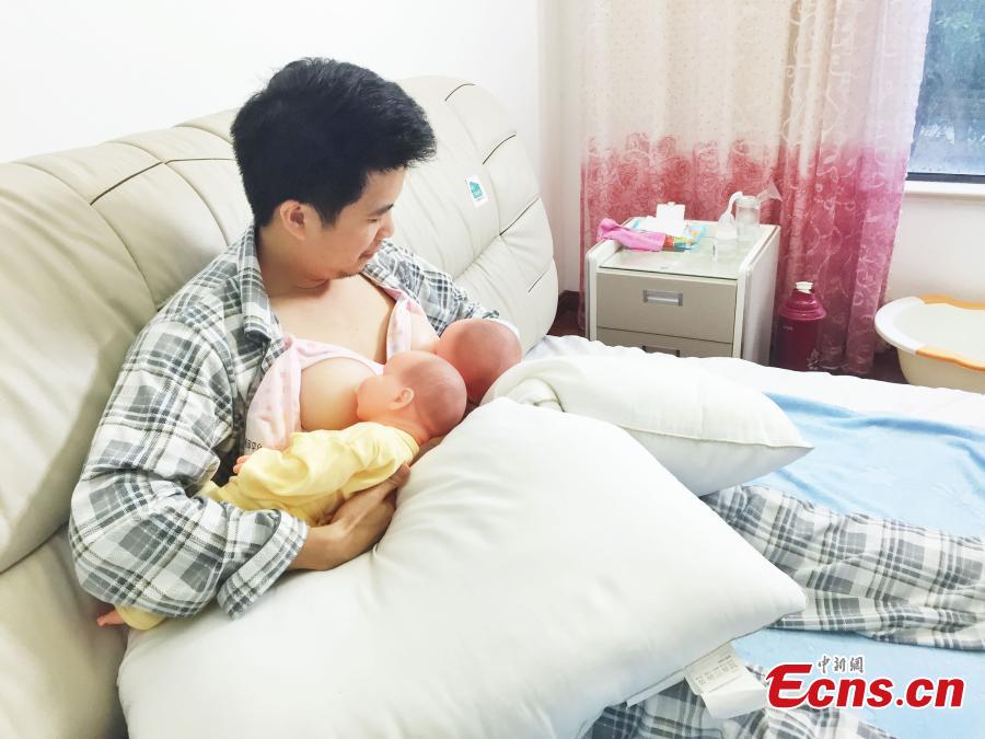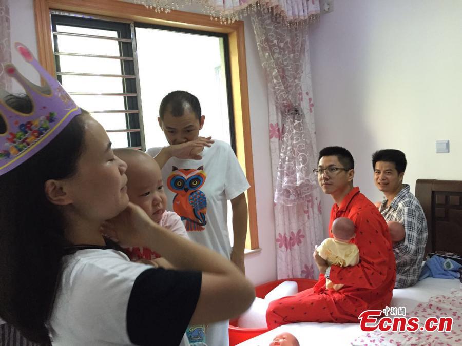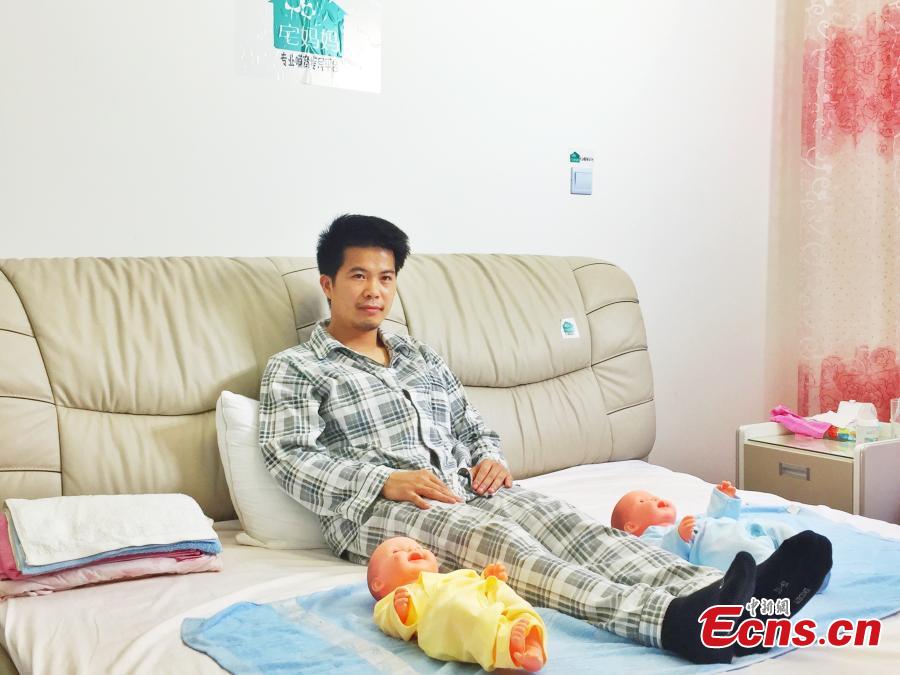 Three married men experience the traditional Chinese practice of postpartum care, known as zuoyuezi, in Shanghai, Aug 10, 2015. The participants are required to perform tasks such as changing a baby’s diapers and breast feeding every four hours. They are not allowed to watch TV, use a cellphone, or leave the house. Believers in zuoyuezi, which literally means "siting the month," take precautions to protect mothers who have just given birth. It typically lasts for a month after the birth of the child, and mothers are advised to not eat cold food, expose themselves to crowds or even showers. (Photo: China News Service/Xu Mingrui)