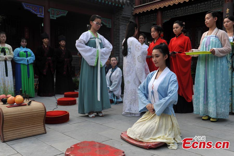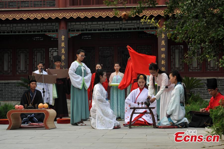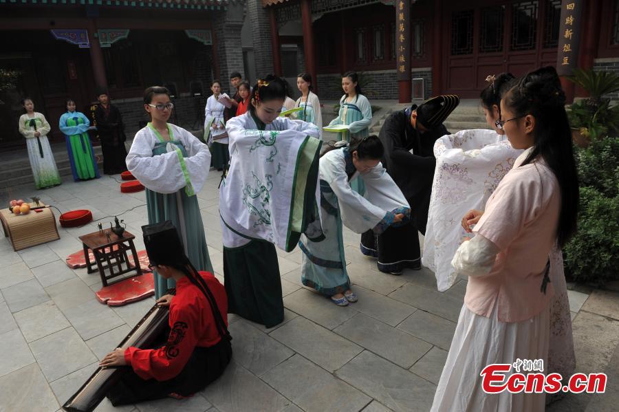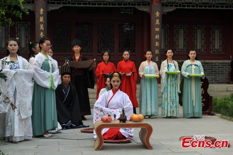 Members of a Guqin association re-enact a traditional coming-of-age ceremony in Liaocheng city, East China’s Shandong province, Aug 10, 2015. The Guqin is a plucked seven-string Chinese musical instrument of the zither family. Historically, the Confucian coming-of- age ceremony has been the "Guan Li" for men and the "Ji Li" for women. The ceremony usually takes place when a young person reaches around 20 years. The ceremonies are now rarely practiced in China, but they are seeing a resurgence. (Photo: China News Service/Xu Wenhao)