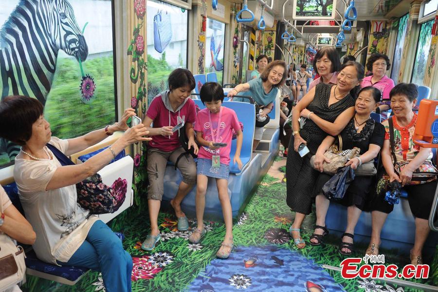A 3D-themed tram runs on a line in Guangzhou, South China’s Guangdong province, Aug 11, 2015. The tram, decorated with 3D pictures, has attracted many visitors. (Photo: China News Service/Cui Yukun)