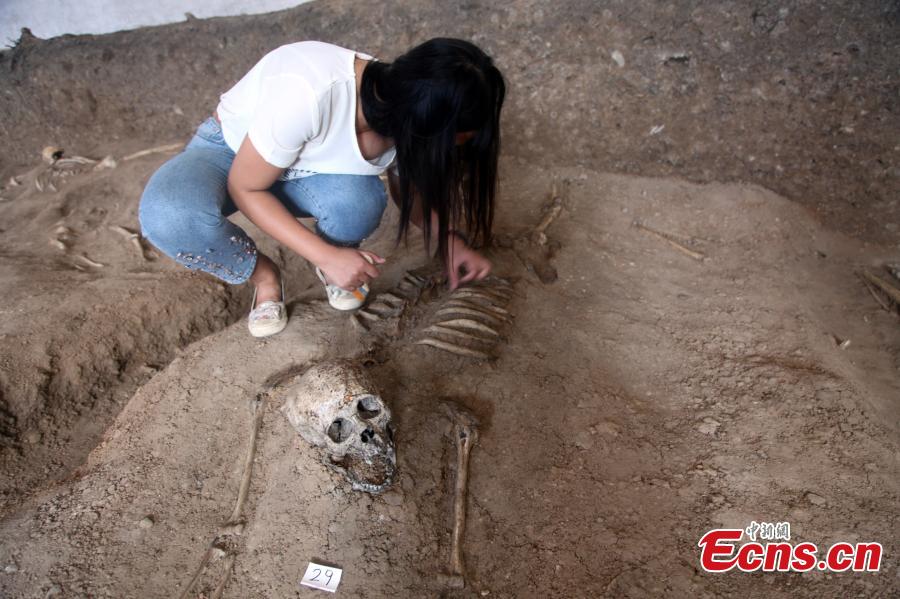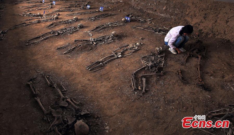Pan Sijie works at a mass grave of Chinese laborers forced by Japanese troops to build a hydropower station during World War II in Jilin city, Northeast China’s Jilin province. Pan, 25, has spent numerous hours sorting the remains of forced Chinese laborers. To date, 35 intact human bones and thousands of damaged bones, 38 relics, and 400 historical photos have been found at the site. It is estimated that Japan forced 110,000 Chinese laborers to work for the project and tens of thousands of them died and were buried in mass graves. (Photo: China News Service/Cang Yan)