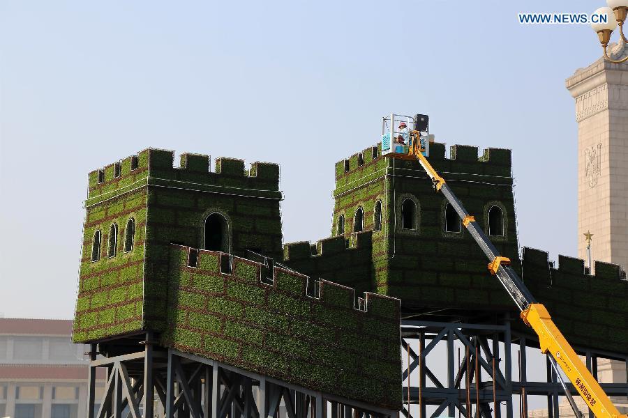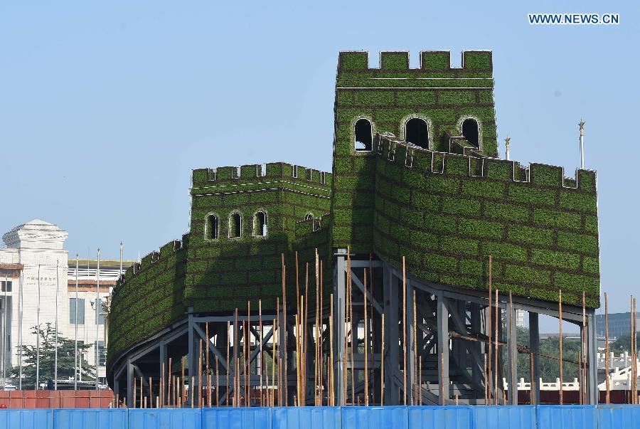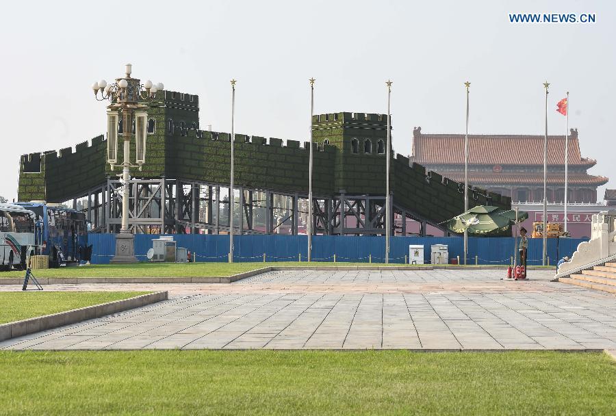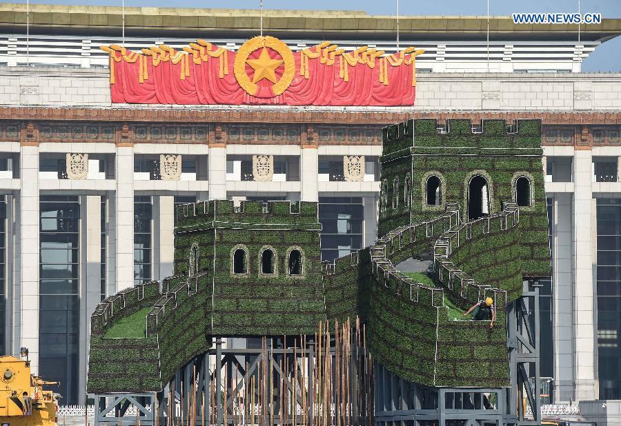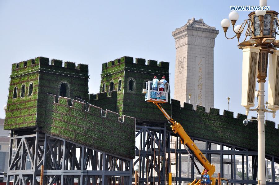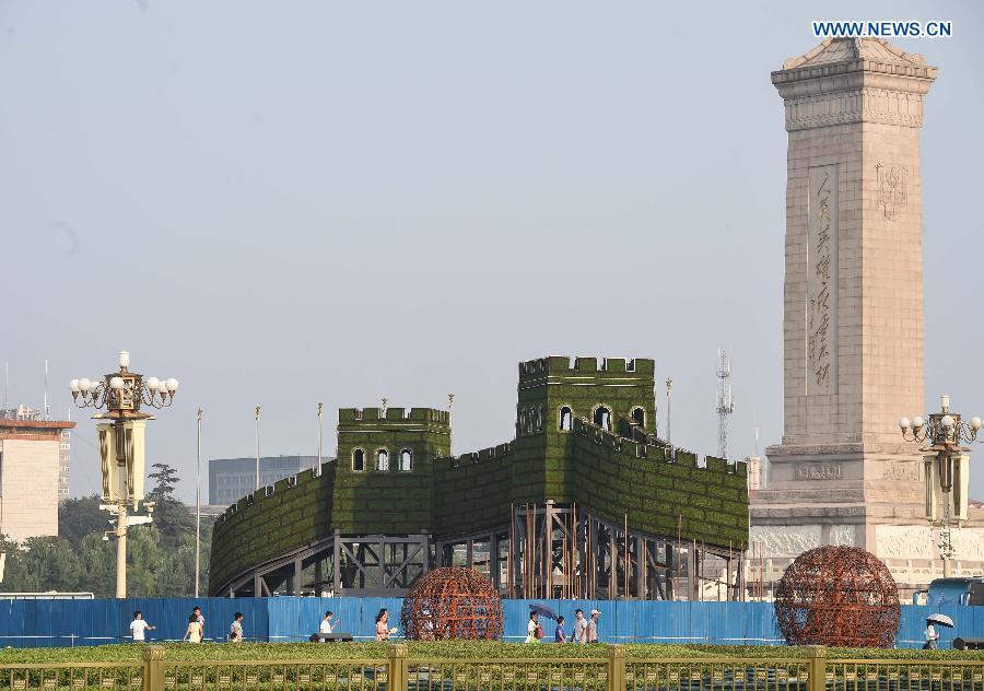 Workers set up a parterre in the shape of the Great Wall at the Tiananmen Square in Beijing, capital of China, Aug. 12, 2015, for a ceremony to mark the 70th anniversary of the victory of the Chinese People's War of Resistance Against Japan, slated for Sept. 3.