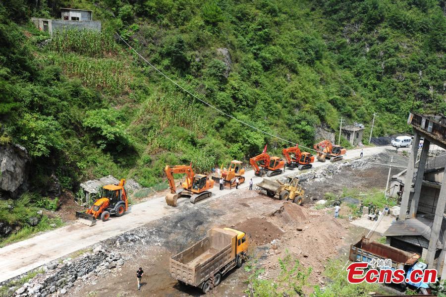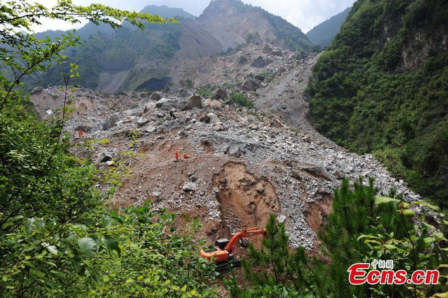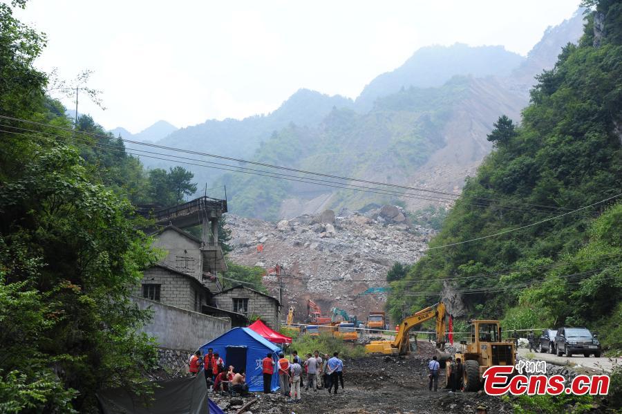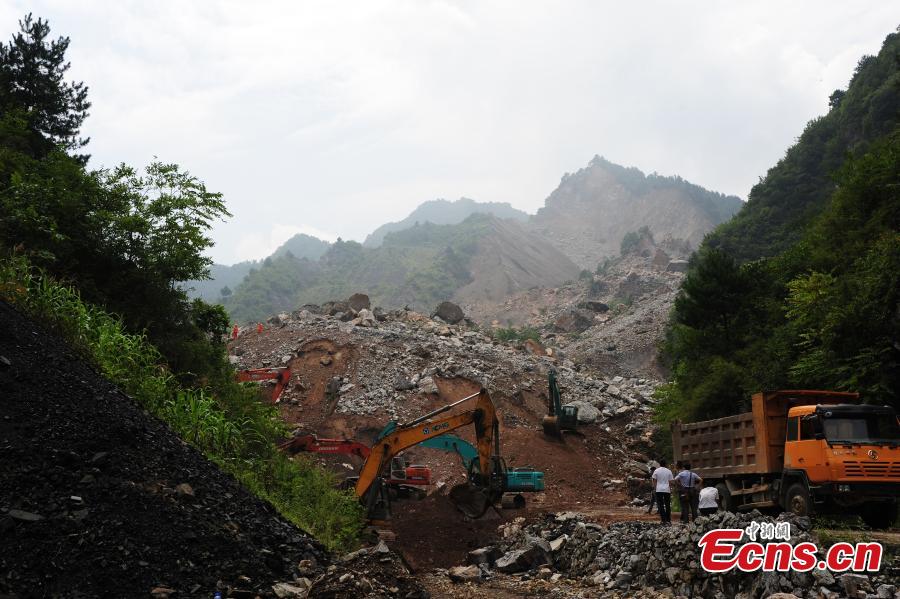 Rescuers work at the site of a landslide in Shanyang county, Northwest China’s Shaanxi province, Aug 12, 2015. Sixty-five people are still missing since a landslide buried the living quarters of a mining company in the mountainous county. The geological situation around the site of the tragedy remains unstable with the prospect of further landslides. (Photo: China News Service/Wang Shihua)