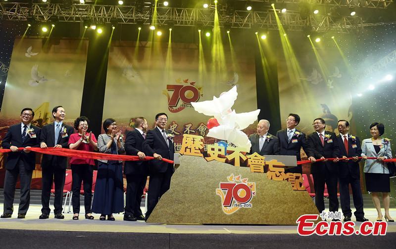 Tung Chee-hwa (5th R), vice chairman of the National Committee of the Chinese People's Political Consultative Conference, and Zhang Xiaoming (4th R), head of the Liaison Office of the Central People's Government in Hong Kong, attend a gala to mark the 70th anniversary of the victory of the Chinese people's war against Japanese aggression and the world's anti-Fascist war, in Hong Kong, south China, Aug. 12, 2015. (CNS photo/Hong Shaokui)