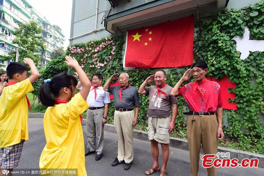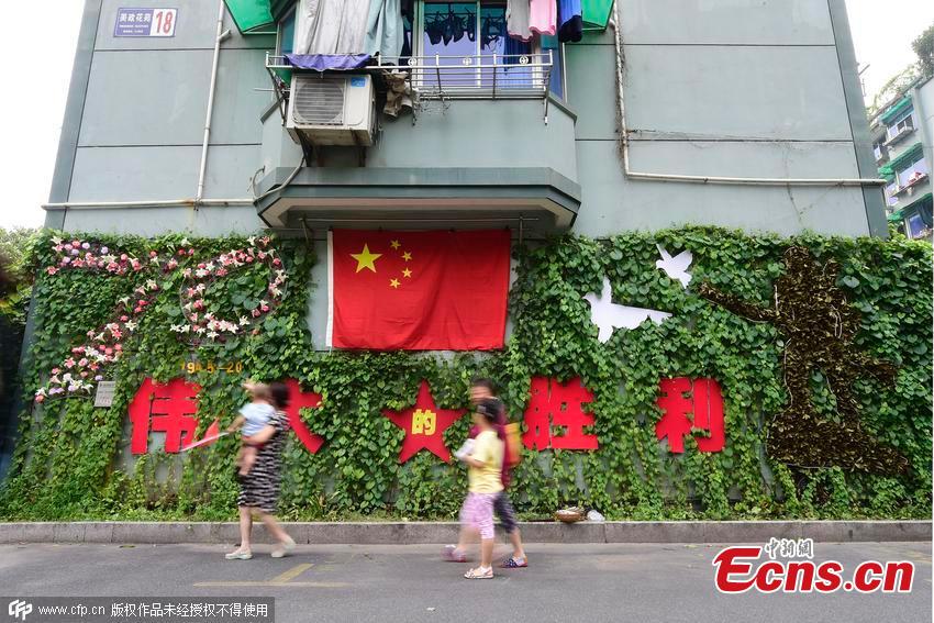 He Chuyi puts the final touches on his gardening work, which is inspired by the 70th anniversary of victory in the Chinese People's War of Resistance Against Japanese Aggression (1937-1945), in Hangzhou, East China’s Zhejiang province, Aug 13, 2015. Local resident He used hundreds of climbing plants to create the work over four months. Since 2008, he has been using climbing plants to represent various themes, including the Olympic Games and the Shanghai Expo, and has become a popular sight in his community. (Photo/CFP)