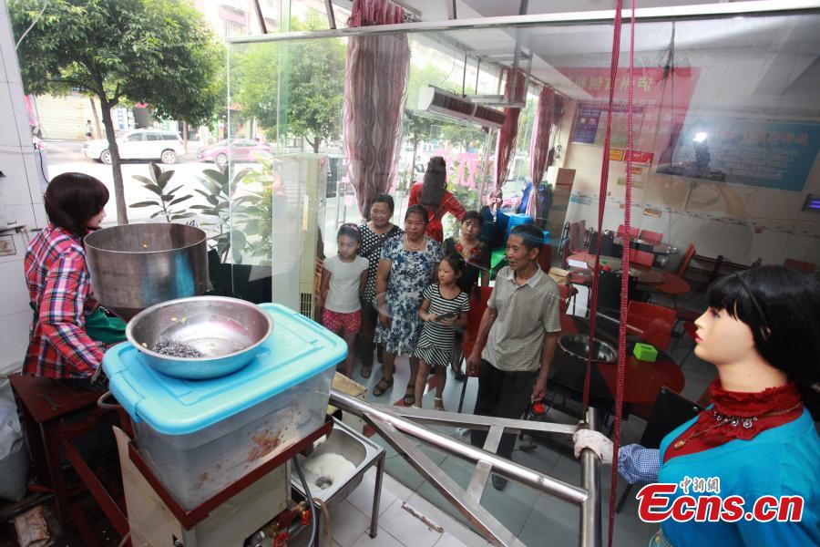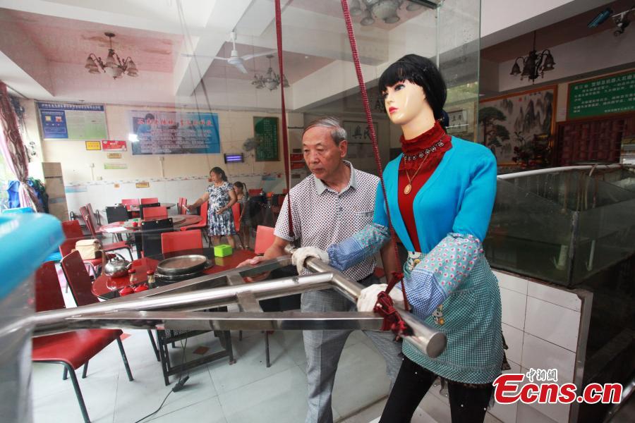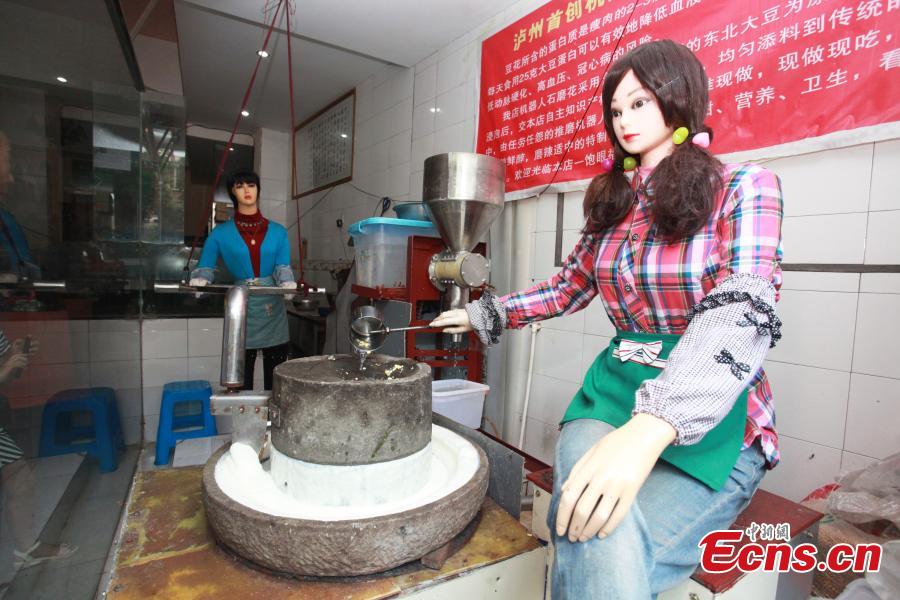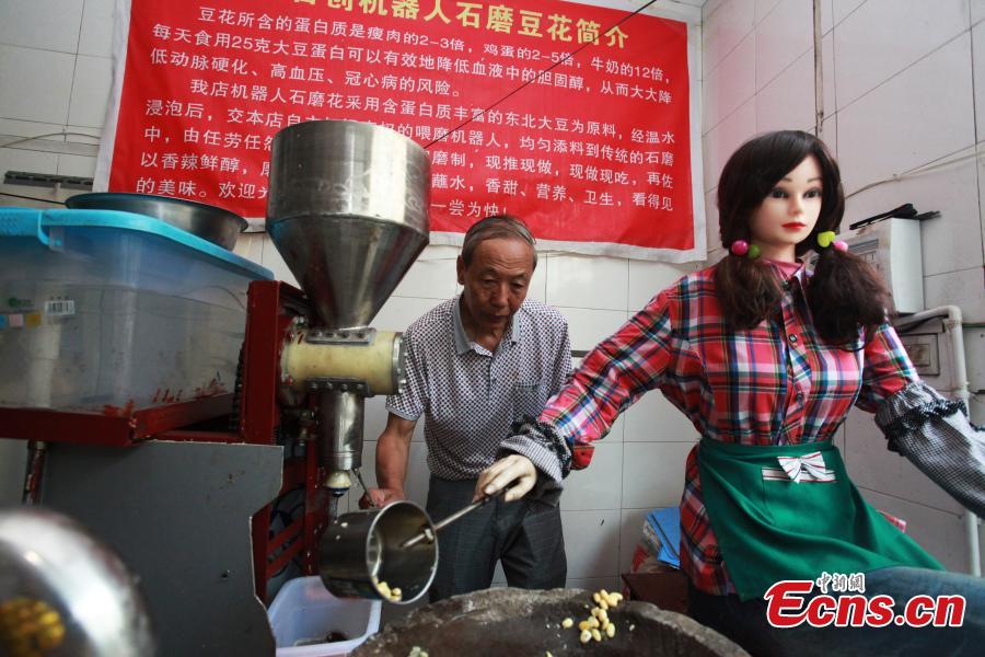 Retired engineer Zou Shumin, 72, controls a robot that makes tofu pudding at a restaurant in Luzhou city, Southwest China’s Sichuan province, Aug 14, 2015. (Photo: China News Service/Liu Chuanfu)