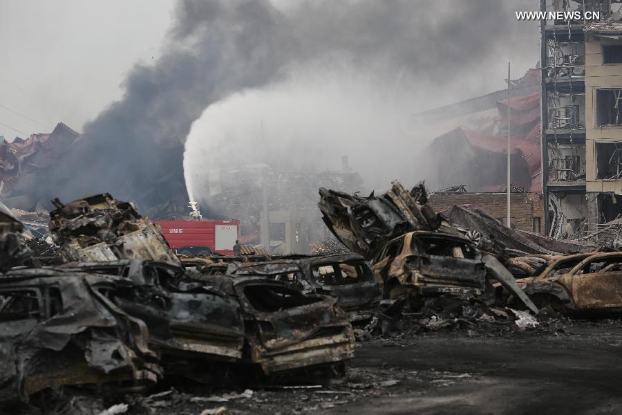 Firefighters work at the warehouse explosion site in Tianjin, north China, Aug. 14, 2015. The death toll has risen to 56, including 21 firemen, from massive warehouse explosions that hit Tianjin Wednesday night, local authorities said Friday. Meanwhile, 721 others were hospitalized, including 25 critically wounded and 33 in serious condition. Firefighters have mostly extinguished the flames at the site. (Photo: Xinhua/Yue Yuewei)