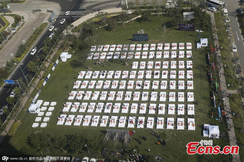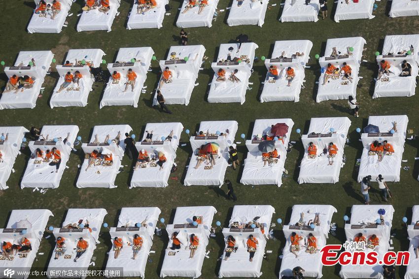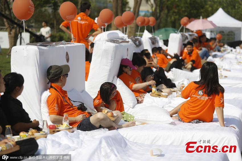 Over 400 people gather in a hotel of Beijing on August 16, 2015 to break a previous Guinness World Record set in Shanghai in 2014. The breakfast-in-bed gathering in the capital city set a new record, besting a previous mark of 388 people set in 2014 in Shanghai. (Photo/CFP)