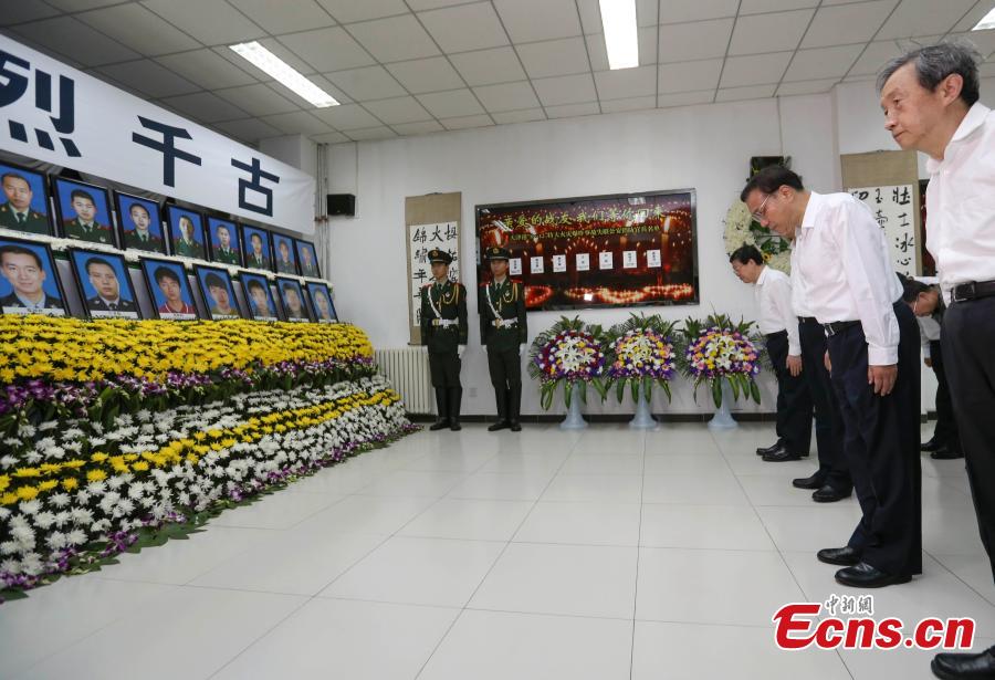Chinese Premier Li Keqiang pays his respects to firefighters and policemen killed in the Tianjin warehouse blasts on Sunday,August 16,2015.(Photo:China News Service/ Liu Zhen)