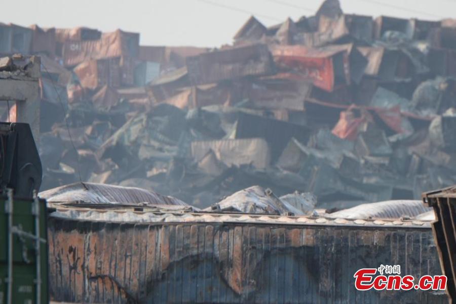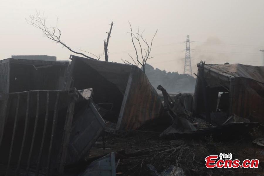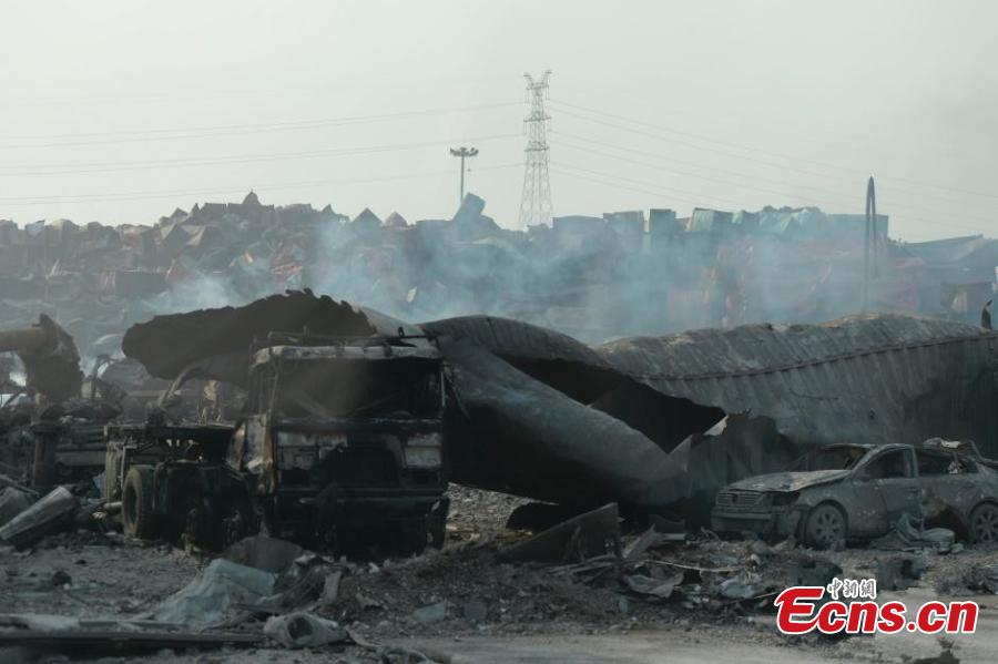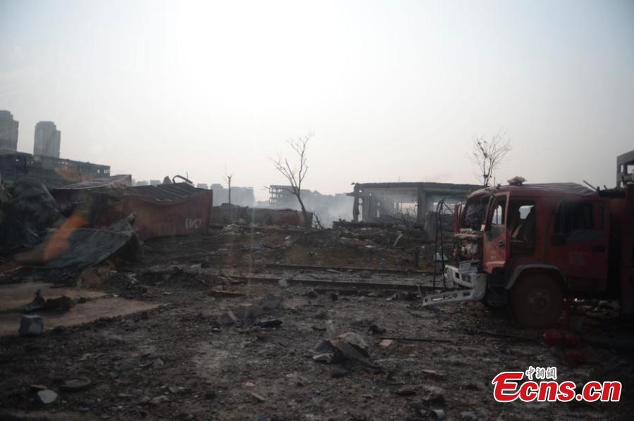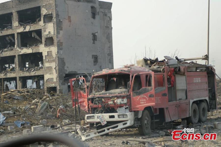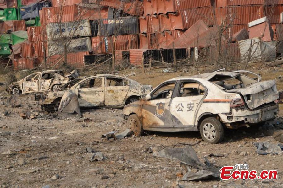 Firefighting vehicles and police cars are among those damaged at the explosions site in Binhai New Area of northern Chinese city Tianjin, Aug 16, 2015. A total of 112 bodies have been found, and 95 people remain missing, including 85 firefighters, after Wednesday night's warehouse explosions. (Photo: China News Service/Liao Pan)