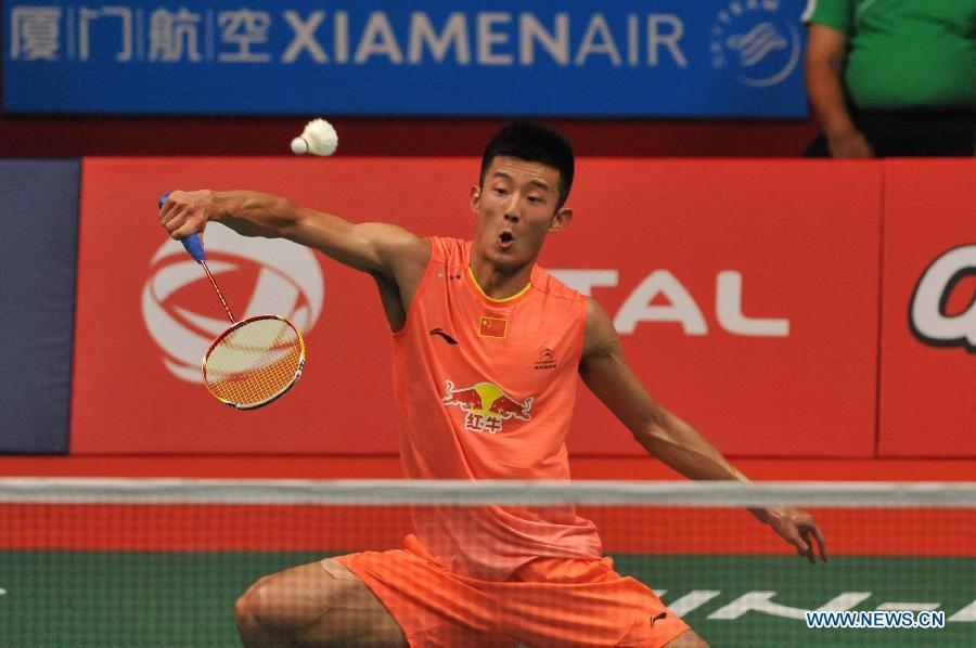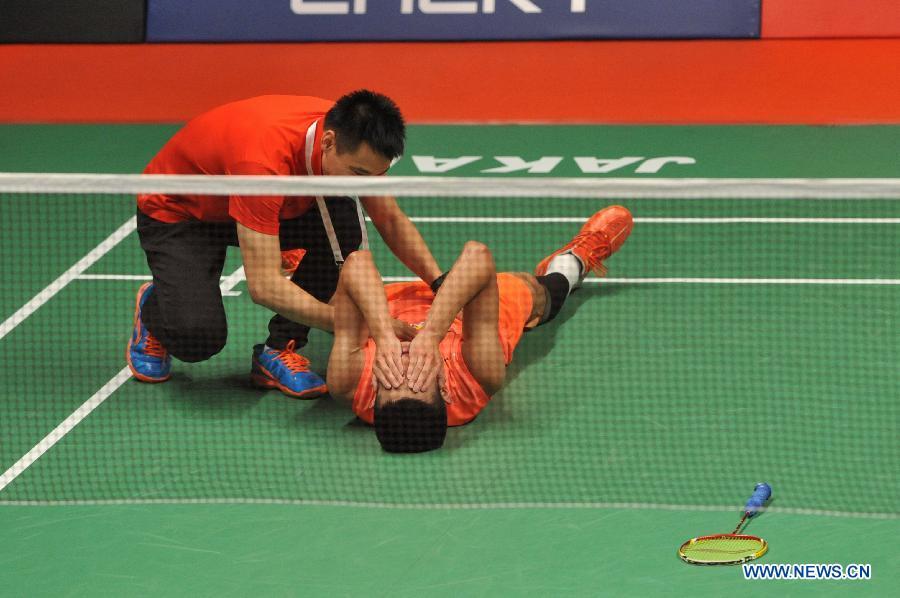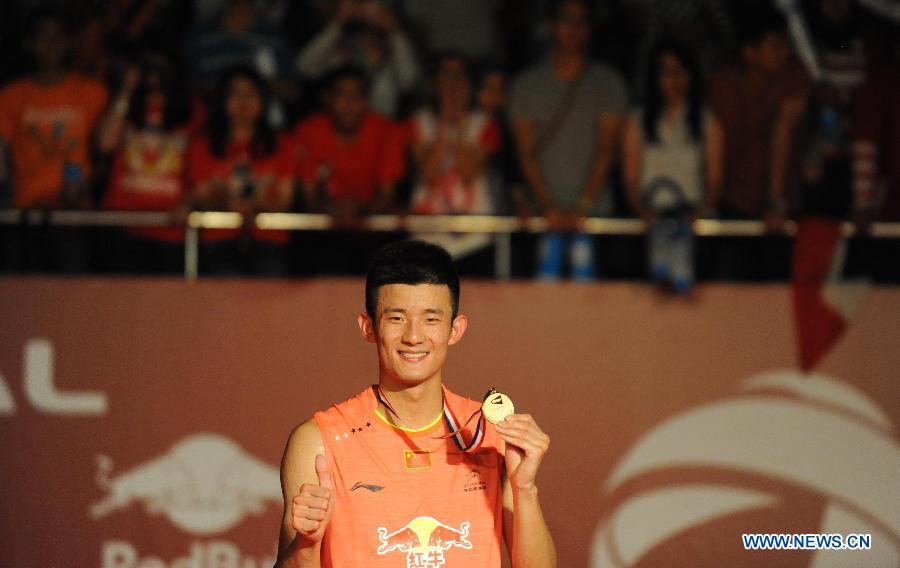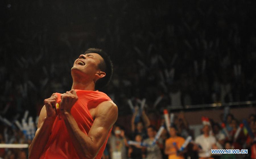 Chen Long of China celebrates for victory after winning the men's singles final match against Lee Chong Wei of Malaysia at the BWF World Championships 2015 in Jakarta, Indonesia, Aug. 16, 2015. Chen Long won 2-0 to claim the champion. (Photo: Xinhua/Veri Sanovri)