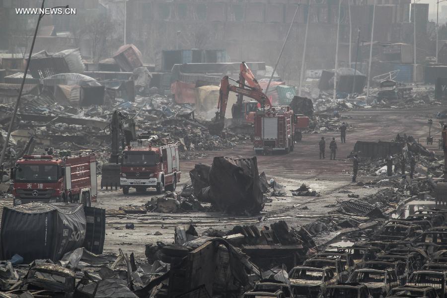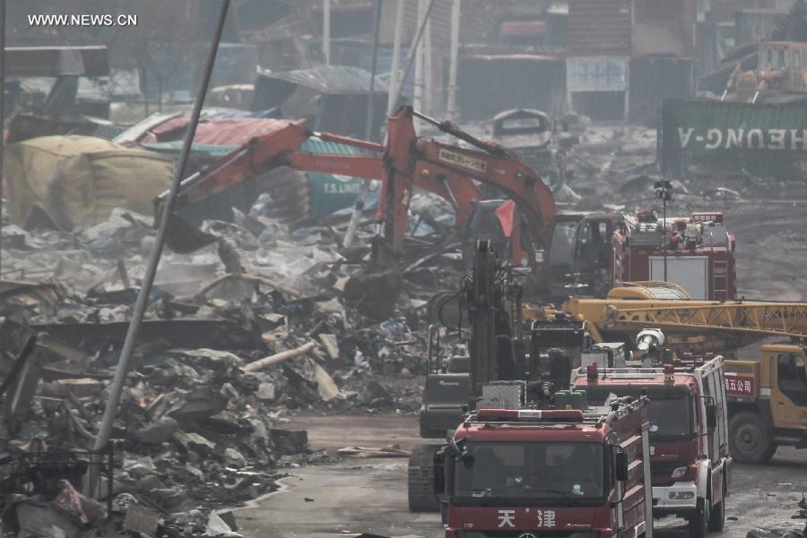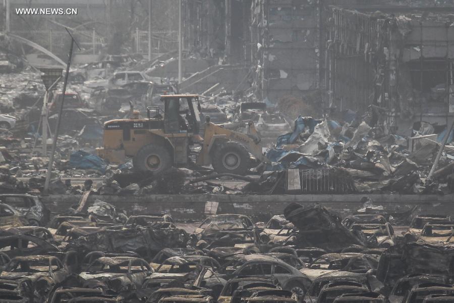 Bulldozers clear off wreckage at the warehouse explosion site in Tianjin, north China, Aug. 17, 2015. Death toll of the massive Tianjin blasts rose to 114 after rescuers found two more bodies in the debris, a municipal publicity official said on Monday. (Photo: Xinhua/Zheng Huansong)