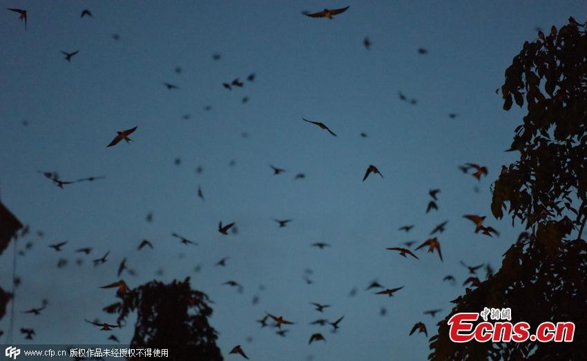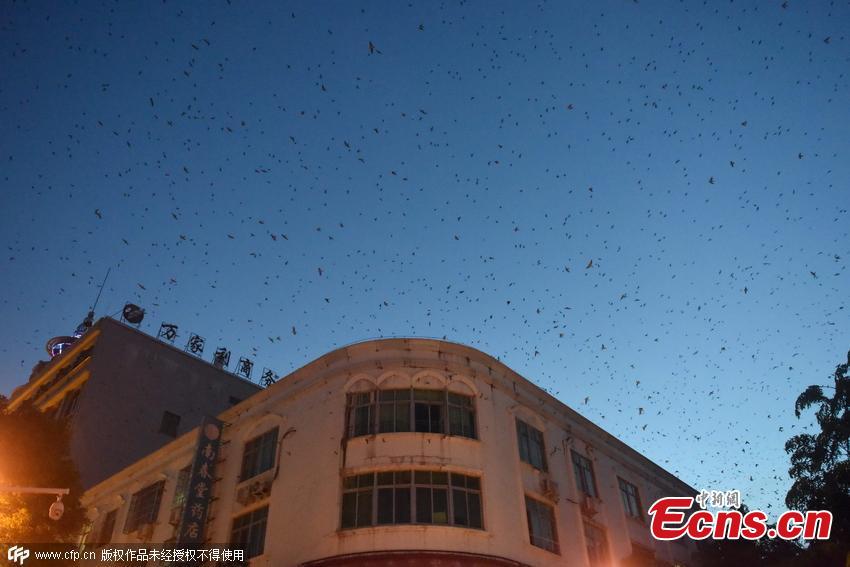 Flocks of birds fly near residential buildings in Qionghai city, South China’s Hainan province. Numerous birds perch on trees near buildings, annoying local residents, who have tried to scare them away with fireworks and bamboo poles. (Photo/CFP)