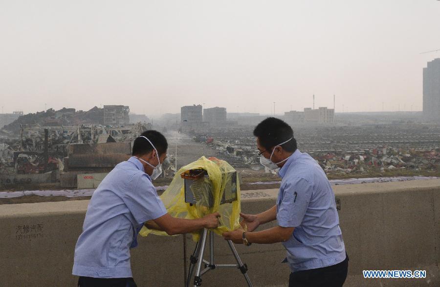 Raindrops are seen on the windscreen of a car near the explosion site in Tianjin, north China, Aug. 18, 2015. A rainfall began to hit the city on Tuesday. (Photo: Xinhua/Wang Shen)