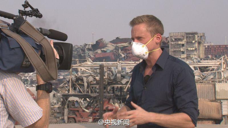 The news center for the Tianjin blasts organized more than 60 domestic and foreign media organizations including CNN, Al Jazeera, France Televisions to make interviews on an overpass about 300 meters away from the core area. (Photo: CCTV/Qian Jiang, Wen Jie)