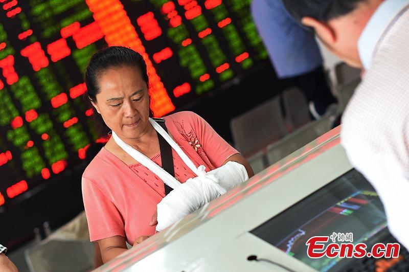 Aug. 18, Taiyuan, an injured woman is checking the stock points at a stock exchange shop. the SSE went down over 6%, loses 3800 points today. (CNS photo/Wu Junjie)