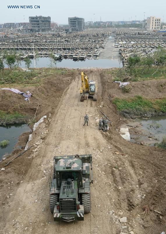 Soldiers clear a route at the explosion site in Tianjin, north China, Aug. 19, 2015. Chinese soldiers are clearing a second emergency route to aid access to the core area of two massive explosions at a warehouse in Tianjin. (Photo: Xinhua/Wang Qingqin)