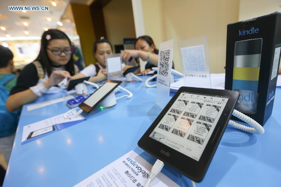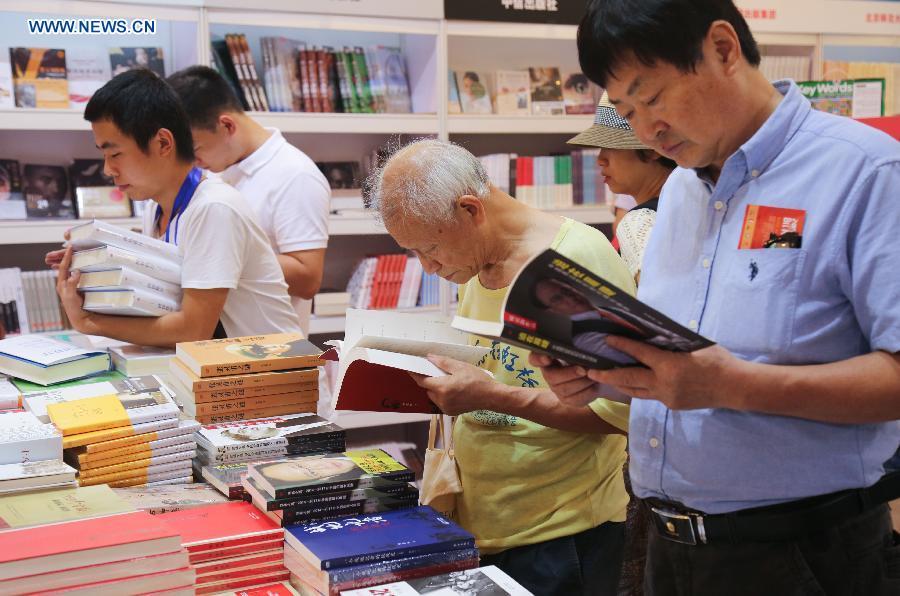 Readers select books at the 2015 Shanghai Book Fair in Shanghai, east China, Aug. 19, 2015. Over 500 publishing companies displayed more than 150,000 kinds of books and held some 700 reading activities at the book fair that kicked off here on Wednesday. (Photo: Xinhua/Lu Yuting)