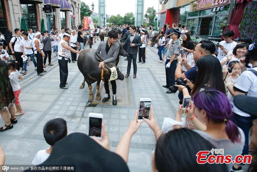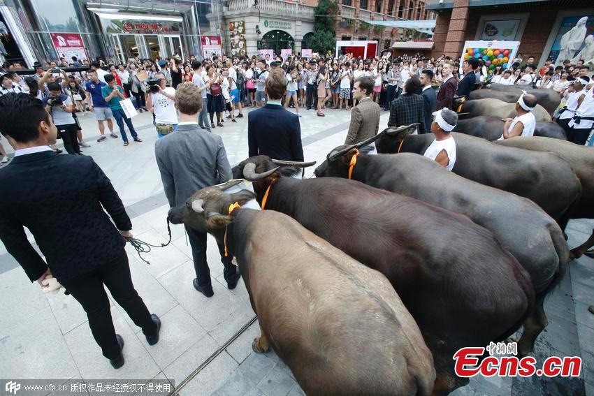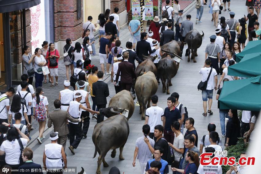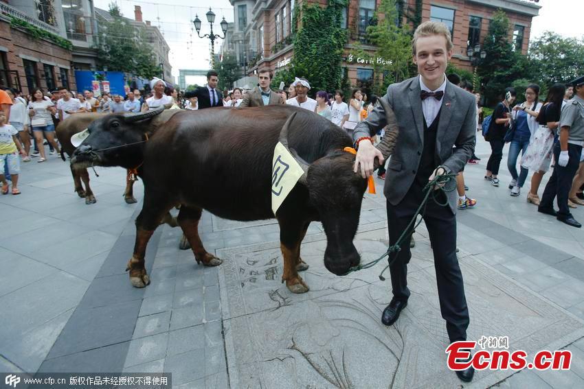 Foreigners lead cows during the celebration of Qixi Festival in Wuhan, Central China’s Hubei province, Aug 19, 2015. Qixi Festival, often known as the Chinese Valentine's Day, is celebrated on the seventh day of the seventh month of the Chinese lunar calendar, and falls on Thursday, Aug 20 this year. According to traditional Chinese folklore, it is the day when the Weaver Girl (Zhinu) and Cowherd (Niulang) can finally reunite for a night after a year's separation. (Photo/CFP)