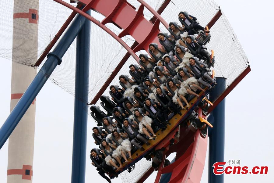 Fifteen couples take part in a group wedding ceremony at the Happy Valley theme park in Shanghai, Aug 20, 2015. The newlyweds rode a roller coaster that dives from a height of 65 meters above the ground and performs thrilling turns. (Photo: China News Service/Pan Suofei)